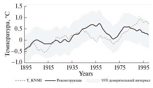 Рис. 5. Сглаженные 10-летние температуры на интервале 1895–2003 гг. (https://climexp.knmi.nl) и реконструкция по геохимическим данным, 95%-ный интервал погрешности реконструкции.