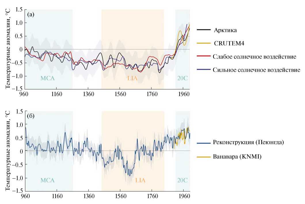 Рис. 6. Региональные температурные реконструкции: a – сравнение литературных метеоданных (CRUTEM4 – набор данных глобальных исторических аномалий температуры воздуха с 1850 года) и реконструированных изменений температуры Арктики [9, 19]; б – сравнение средних десятилетних инструментальных метеоданных (п. Ванавара) и полученной нами температурной реконструкции в районе озера Пеюнгда. Серым показан 95%-ный интервал неопределенности.