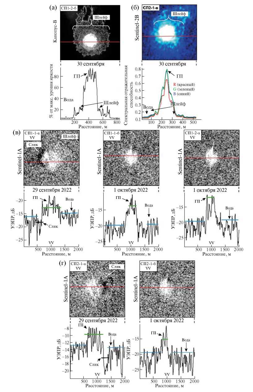 Рис. 4. Результаты обработки спутниковых оптических (а, б) и радиолокационных (в, г) изображений интенсивных антропогенных ГП, связанных с повреждениями газопроводов в Балтийском море. Красные линии на изображениях соответствуют графикам профилей яркости (для данных Канопус-В, панхроматический канал), спектральной отражательной способности (для данных Sentinel-2B, спектральные каналы видимого диапазона) и УЭПР (для Sentinel-1А). Синие, зеленые и черные линии на профилях УЭПР демонстрируют средний уровень сигналов для воды (фона), ГП и сликов соответственно.