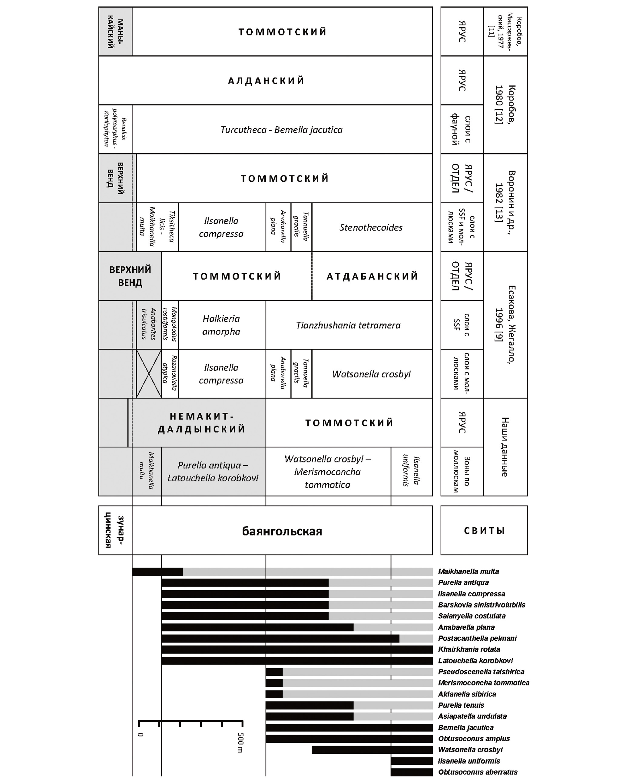 Самые древние археоциаты в Западной Монголии известны [9] только на уровне середины нижнего кембрия (верхний атдабан – ботома), поэтому ведущая роль в расчленении и корреляции базальных слоев кембрия здесь принадлежит мелкораковинным ископаемым. Впервые томмотский фаунистический комплекс в разрезах Дзабханской зоны установил В. А. Сысоев [10] по хиолитам и проблематикам из баянгольской свиты разреза Баян-гол. Позднее М. Н. Коробов и В. В. Миссаржевский [11] обосновали отложения томмотского, атдабанского и ленского ярусов в разрезе Салааны-гол по находкам проблематик, моллюсков и хиолитов, а М. Н. Коробов впервые выделил слои с ископаемыми [12]. Попытки выделения более дробных биостратиграфических подразделений в этом стратиграфическом интервале были продолжены в монографиях сотрудников ПИН АН СССР [9, 13], где на основе многолетних экспедиционных работ (1978–1991 гг.) и детальных фаунистических исследований для нижнего кембрия Западной Монголии выделены слои с фауной по моллюскам и проблематикам (рис. 2).