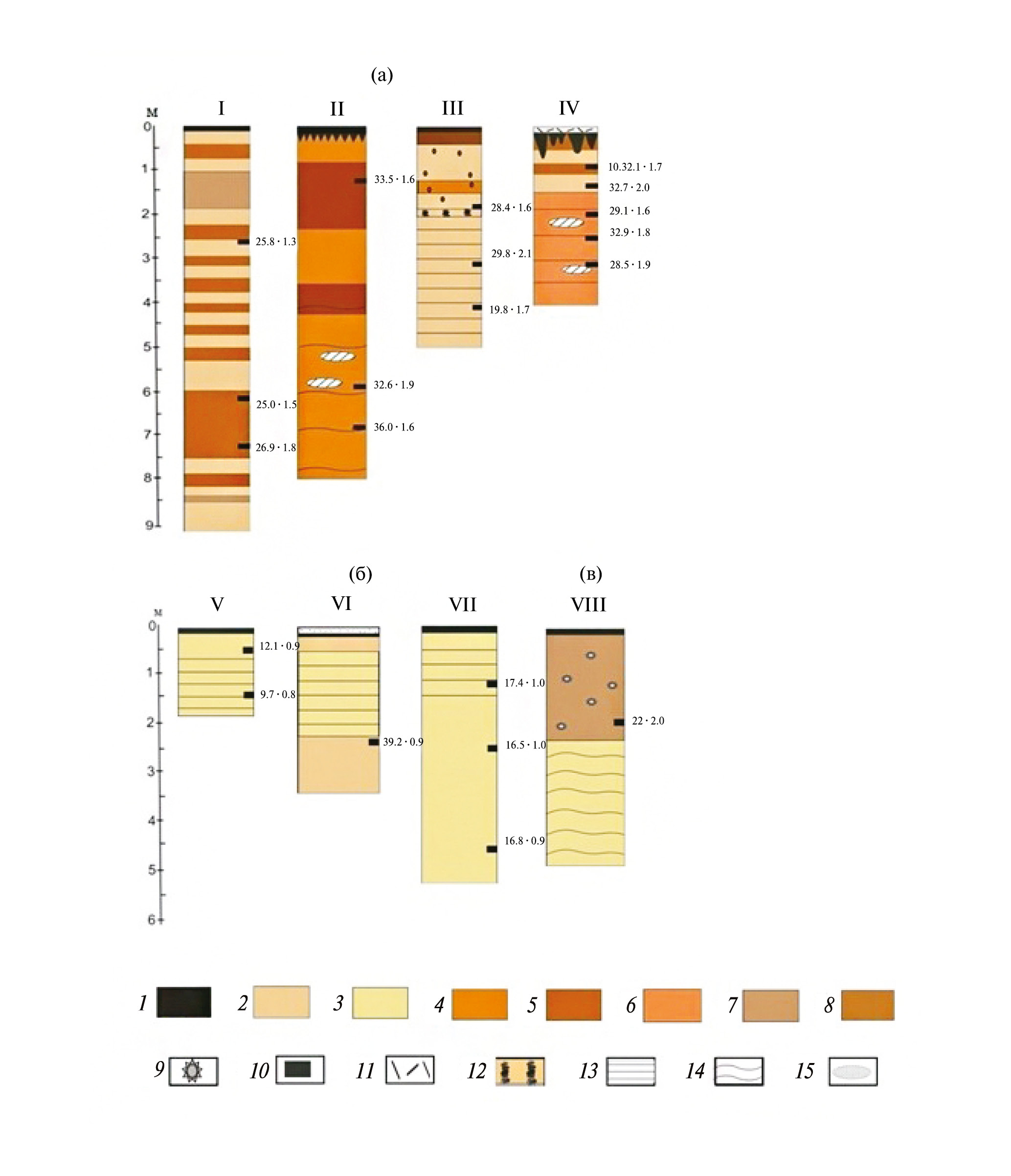 Рис. 2. Строение полученных разрезов: а – грив (I – Кареглазова, II – Большеудалово, III – Чуртан, IV – Красноорловское): б – дюнных песков (V – Озерное, VI – Илецкий, VII – Подгорное); в – делювиального шлейфа (VIII – Пеньково). Литология: 1 – современная почва; 2 – алеврит песчанистый; 3 – песок мелкозернистый; 4 – песок алевритно-глинистый; 5 – песок глинистый; 6 – песок алевретисто-сильноглинистый; 7 – песок сильноглинистый; 8 – глина песчано-алевритовая; 9 – карбонатные конкреции; 10 – места отбора проб и их возраст (тыс. л. н.); 11 – антропогенный слой; 12 – палеопочва (?). Текстуры: 13 – горизонтальная; 14 – волнистая; 15 – линзовидная.