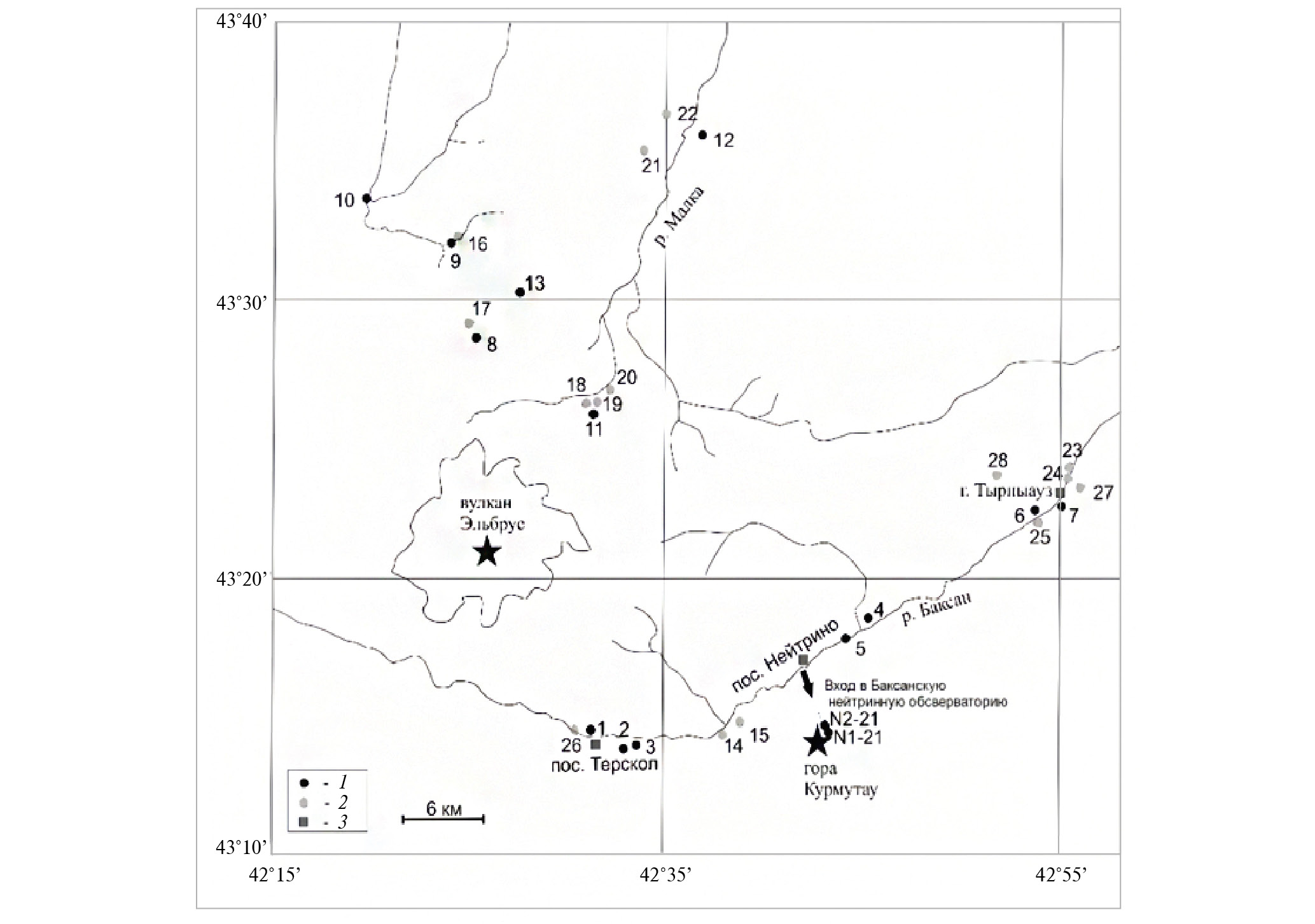 Рис. 1. Схема опробования углекислых минеральных и пресных вод Приэльбрусья. 1 – углекислые источники; 2 – поверхностные воды; 3 – населенные пункты. Номера пунктов опробования соответствуют номерам в табл. 1 и 2.