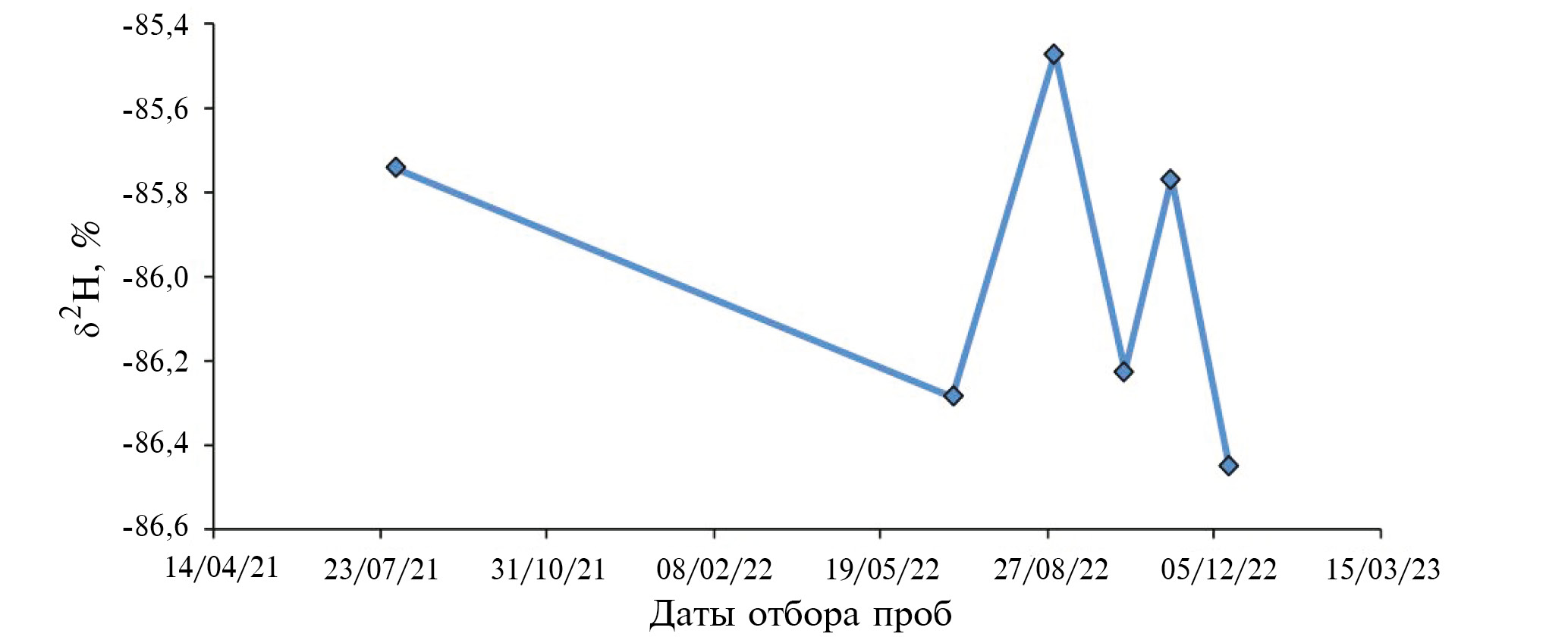 Рис. 2. Результаты повторных замеров δ2Н, выполненных в термальном источнике (41.3°С), находящемся вблизи забоя штольни Нейтрино.
