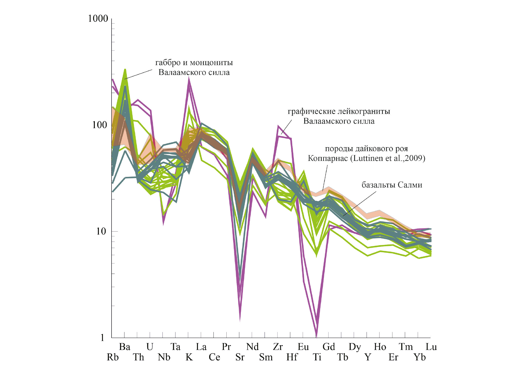 Рис. 3. Мультиэлементная диаграмма пород Валаамского силла, ферробазальтов Салми из Ладожского грабена и мафических пород Салминского массива [4]. Концентрации элементов в породах нормированы на примитивную мантию по [17].