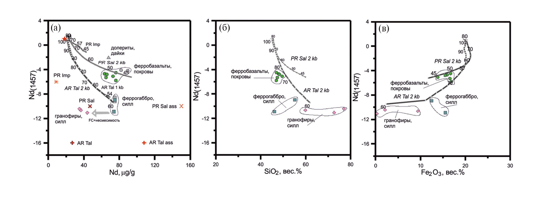 Различие в модельных Nd-возрастах между ферробазальтами (2.4–2.5 млрд лет) и феррогаббро (от 2.5 до 3.0 млрд лет, табл. 2) может указывать на различия в возрасте корового контаминанта.