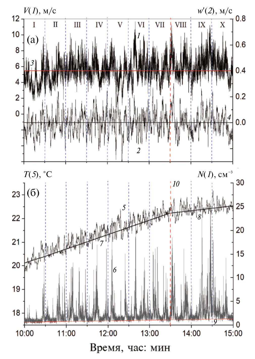 Рис. 1. Временная изменчивость 09.09.2021 в период с 10:00 до 15:00 по данным измерений на высоте 3 м горизонтальной компоненты скорости ветра (1), турбулентных пульсаций (2) вертикальной компоненты скорости ветра (сглажены на интервале 50 сек), пульсации температуры воздуха (5) – сглаженную на интервале 50 с и суммарной концентрации частиц пылевого аэрозоля (6). Обозначения: 3 – пороговая скорость сальтации, 4 – начало отсчета для вертикальной компоненты скорости ветра, 7 и 8 – интервалы кусочно-линейной аппроксимации тренда температуры воздуха, 9 – концентрация фонового аэрозоля, 10 – момент излома кусочно-линейной интерполяции температуры, I–X – 30-минутные интервалы.