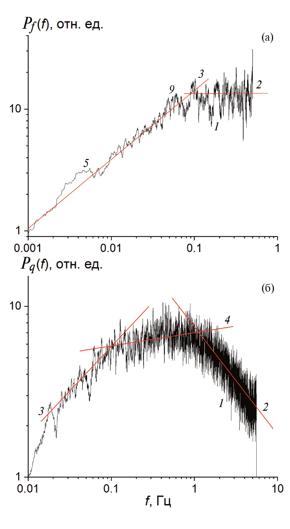 На рис. 2 представлены спектры флуктуаций (кривая 1) где S – спектральная плотность мощности и f – частота, рассчитанные (Origin 2021) по данным измерений V(t) (a), w(t) (б), T`(t) (в) и N(t) (г). Высокочастотная часть спектра (рис. 2 а) аппроксимируется степенной функцией в диапазоне частот примерно от 0.8 до 6.5 Гц где что близко к для режима локально изотропной турбулентности. На частотах > 0.8 Гц спектр Pv(f) с удовлетворительной точностью аппроксимируется другой степенной функцией с показателем что обусловлено определяющим вкладом конвективных движений в вариации V(t). В спектре Pv(f) достаточно отчетливо выражены широкий максимум (5) в диапазоне частот 1–5 мГц (периоды 200 с – 1000 с) и максимум в диапазоне 10– 20 мГц (7), а также слабо выраженные максимумы в диапазонах 15–45 мГц (8) и 50–80 мГц (9).