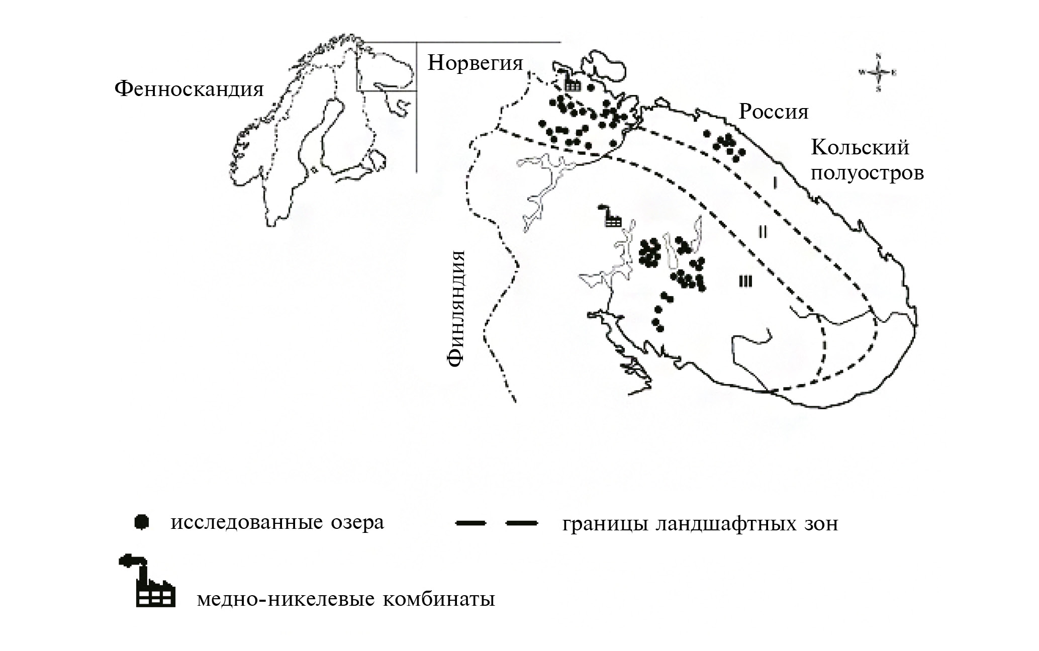Исходными материалами послужила гидрохимическая база данных по малым озерам Кольского Севера за (1990, 1995, 2000, 2010, 2014 и 2018 гг.). На рис. 1 приведена картосхема региона со схемой точек исследования. Изученные озера расположены в тундровой (n = 15), лесотундровой (n = 21) и северо-таежной зонах (n = 32). Всего было исследовано 68 озер. Данные получены на основе методов, используемых в международной практике по программе ICP-Water, которые выполнялиcь по единым методикам в лабораториях Института проблем промышленной экологии Севера КНЦ РАН (ИППЭС КНЦ РАН), который ежегодно принимал участие в международных интеркалибрациях. Более подробно методы исследований изложены в работе [13]. Материалы были обобщены по двум периодам: 1990–2000 гг. и 2010–2018 гг. (табл. 1). Статистическая обработка данных осуществлялась с использованием компьютерной программы “Statistica 10”.