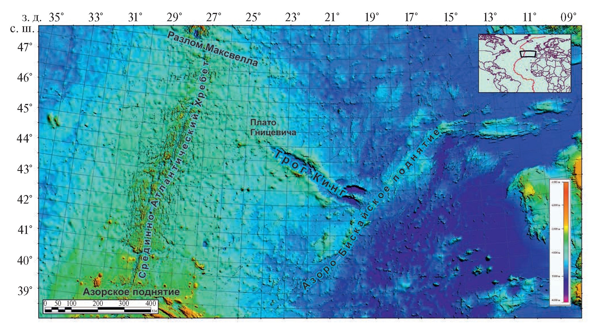 Фланги Срединно-Атлантического хребта (САХ), занимающие огромные площади, системно не изучены и представления об их строении и развитии базируются на экстраполяции процессов, явлений и факторов, установленных при изучении тектоники и магматизма осевой зоны спрединга, дополненных данными спутниковой альтиметрии. Исходя из теоретических представлений тектоники литосферных плит, считается, что фланговые области САХ являются тектонически и магматически пассивными, за исключением тех участков, где происходят процессы, связанные с подъёмом глубинных мантийных плюмов, ведущие к формированию новых магматических и тектонических структур за пределами осевой зоны спрединга. В то же время известны крупные участки океанического дна, для которых проявление плюмовой активности не очевидно, а процессы структурообразования в их пределах происходят при преобладании тектонических процессов. Одним из таких регионов является восточный фланг САХ в Северной Атлантике, где сформировался кластер мезоструктур, состоящий из трога Кинг, впадин Пик и Фрин с разделяющим их хребтом Палмер, и плато Гницевича (рис. 1). Этот мезоструктурный кластер расположился в своего рода уникальном регионе Северной Атлантики: с северо-запада он ограничен крупной приосевой возвышенностью САХ, с юго-востока – Азоро-Бискайским линейным поднятием, простирающимся в юго-западных румбах в направлении Азорского поднятия, сформировавшегося в результате подъёма плюма глубинной мантии (см. рис. 1).
