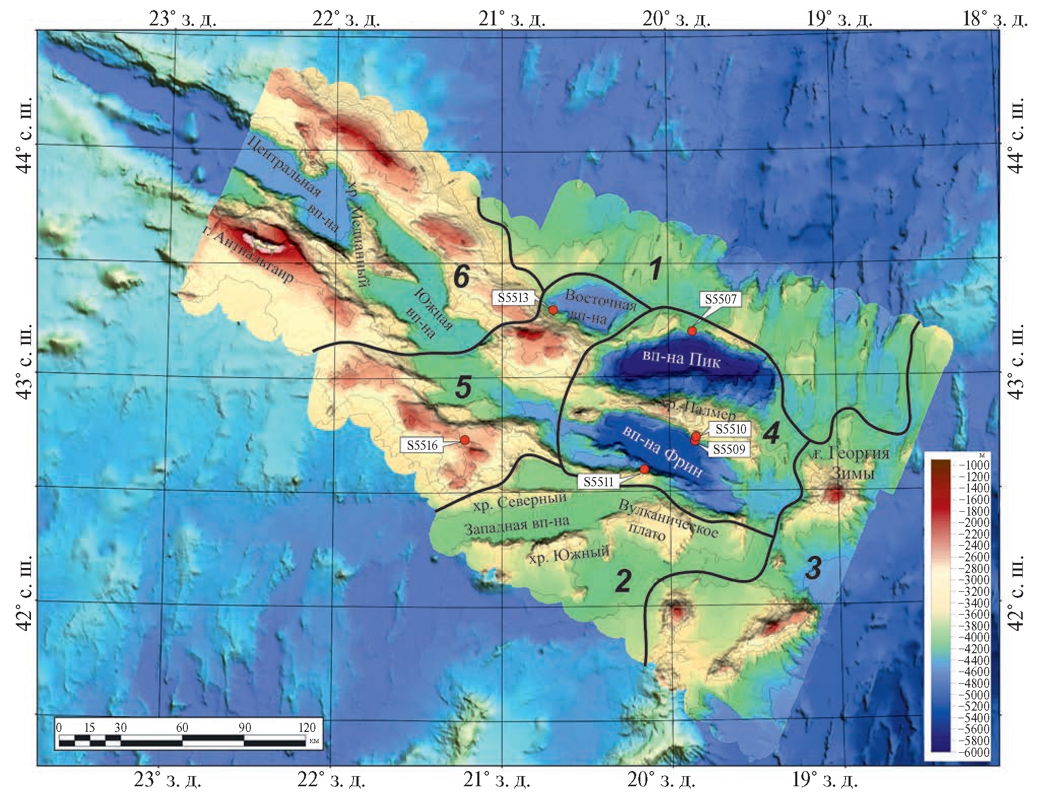 Рис. 2. Схема морфоструктурных провинций. Цифрами обозначены провинции: 1) фланговых структур САХ; 2) юго-восточная; 3) центрального сегмента Азоро-Бискайского поднятия; 4) юго-восточных впадин; 5) юго-восточного окончания трога Кинг; 6) центральной части трога Кинг. Чёрные линии – границы между провинциями. Красные круги – результативные станции драгирования 55-го рейса АНС. В нижнем правом углу – шкала глубин.
