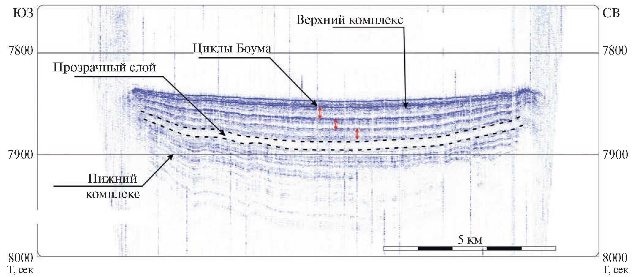 Видимая мощность осадочного чехла во впадине Пик достигает 150 м. Осадки могут быть разделены на два комплекса. Мощности комплексов максимальны в осевой части и уменьшаются к бортам (рис. 3). Эта особенность свидетельствует о конседиментационном осадконакоплении во впадине и её продолжающемся погружении с постепенным уменьшением скорости погружения. Верхние 50 метров разреза характеризуются чётко выраженной цикличностью осадконакопления. Она проявлена в виде нескольких (до 4) интервалов постепенного перехода от прозрачных хаотических отражений, соответствующих быстрому осадконакоплению к ярким протяжённым горизонтам конденсированного разреза. По всей видимости данные отложения были сформированы турбидитовыми потоками, периодически сходившими с бортов впадины и отражают циклы Боума. Впадина Фрин имеет похожее строение осадочного разреза.