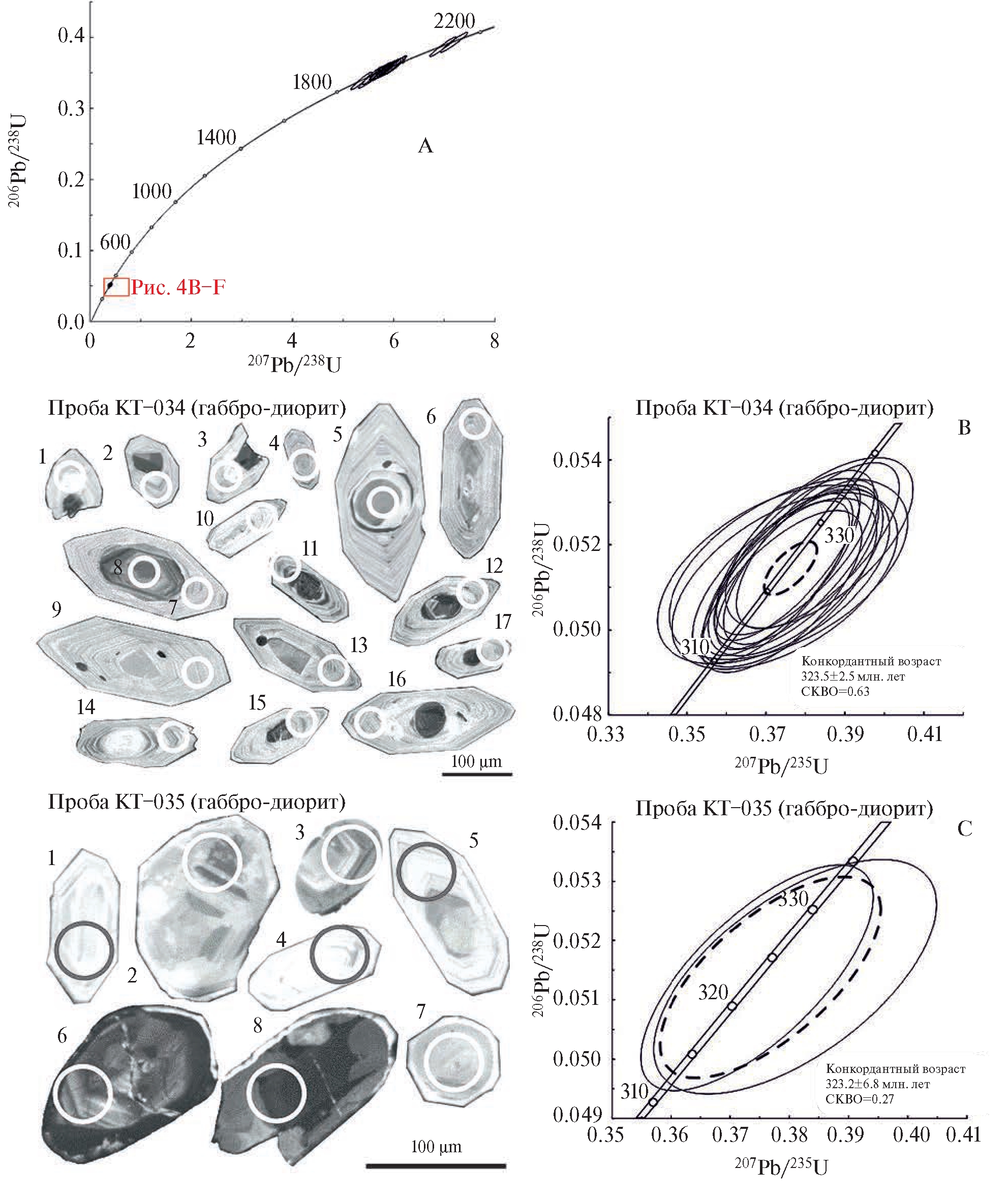 Рис. 3. Катодолюминесцентные изображения кристаллов циркона (окружностями обозначены точки, где проводилось изотопное датирование, номера точек соответствуют таковым в таблице 2) и диаграммы с конкордией для цирконов из пород интрузивного штока месторождении Куру-Тегерек (тонкие сплошные эллипсы – результаты единичных анализов, пунктирный эллипс соответствует конкордантному значению; погрешности единичных анализов и вычисленных конкордантных возрастов приведены на уровне 2σ). А – диаграмма с конкордией с учетом возраста автокристов и ксенокристов циркона. B-F – участки диаграммы с конкордией для автокристов циркона.