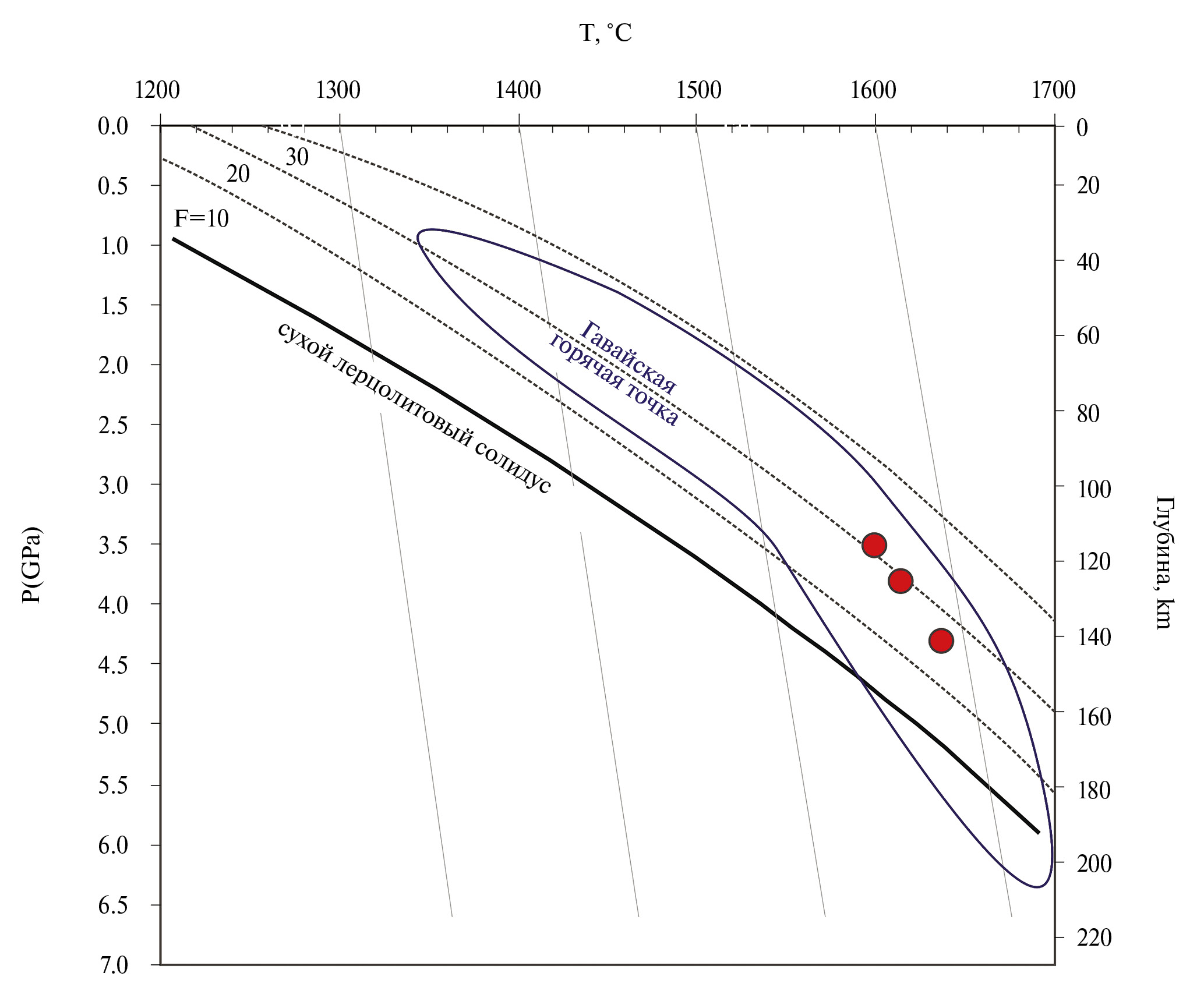Главной особенностью рассматриваемых пикродолеритов является высокое содержание MgO, которое, судя по отсутствию в породах кумулятивных минералов, является характеристикой исходного расплава. Геохимические характеристики пород, такие как слабый отрицательный наклон спектров РЗЭ, отсутствие деплетирования Ta, Nb, Rb, Ba свидетельствуют о подлитосферном источнике пикродолеритов. На тектонических дискриминантных диаграммах, например (рис. 3 б [10]), простые дайки согласуются с составами обогащённых базальтов океанических хребтов или внутриплитных горячих точек мантии. Смещение составов комбинированных даек в поле базальтов вулканических дуг, очевидно вызвано контаминацией. Высокая магнезиальность и невысокая щёлочность и титанистость, а также отмеченные микроэлементные характеристики позволяют предположить, что в источнике пикродолеритовых расплавов преобладали сухие перидотиты подлитосферной мантии. Это позволило нам применить термобарометр [15] и рассчитать температуру и давление выплавления основных расплавов из мантии, которые составили около 1600–1640°С и 3.5–4.3 ГПа, что соответствует глубине около 120–140 км (рис. 6). Степень плавления для сухих условий при этом была весьма высокая и достигала »20%. Такие параметры согласуются, например, с условиями генерации магм Гавайской горячей точки.