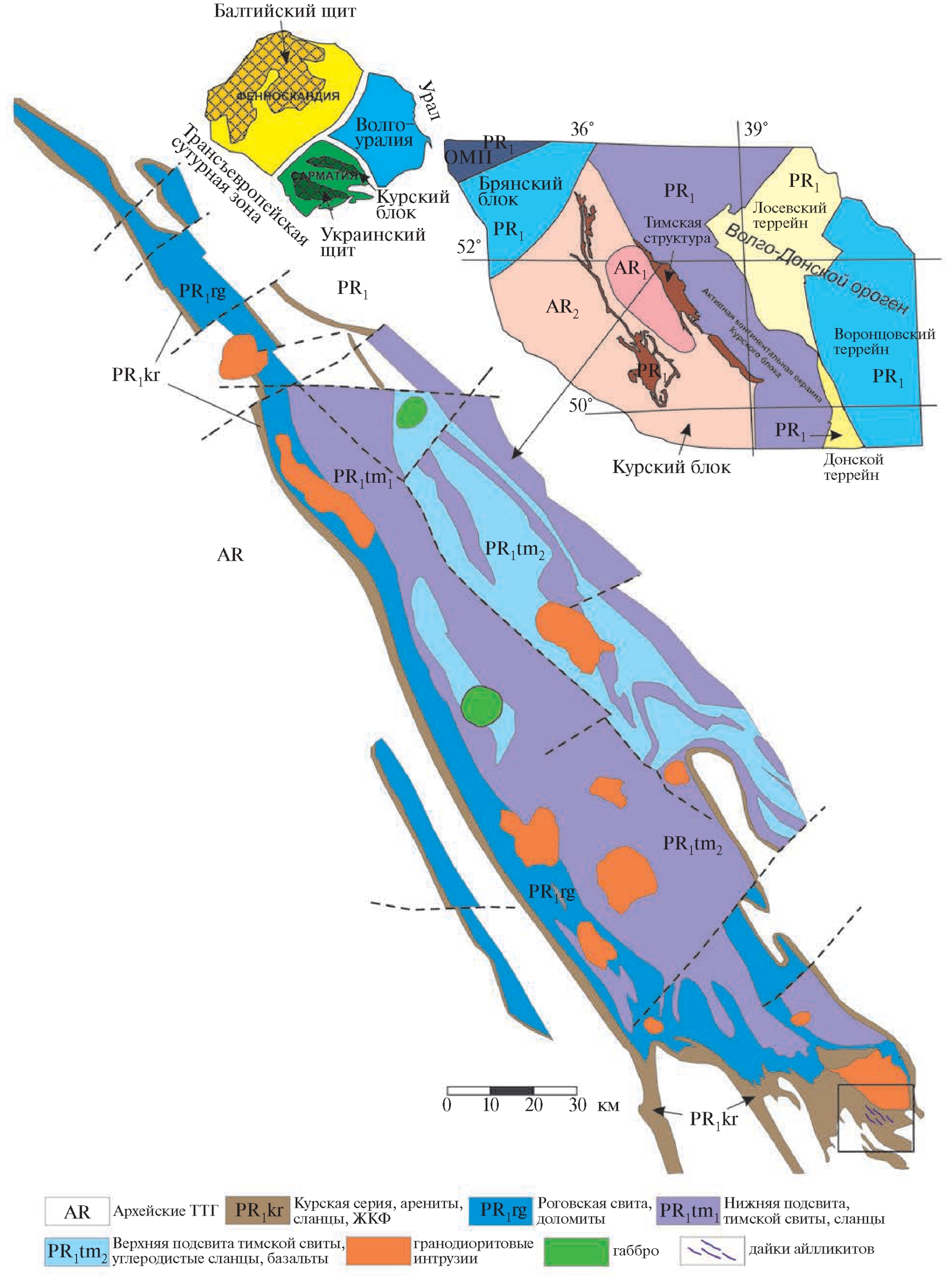 Рис. 1. Схематическая геологическая карта Тимской структуры и положение даек айлликитов с врезками структурной схемы Восточной Сарматии и Восточно-Европейского кратона.