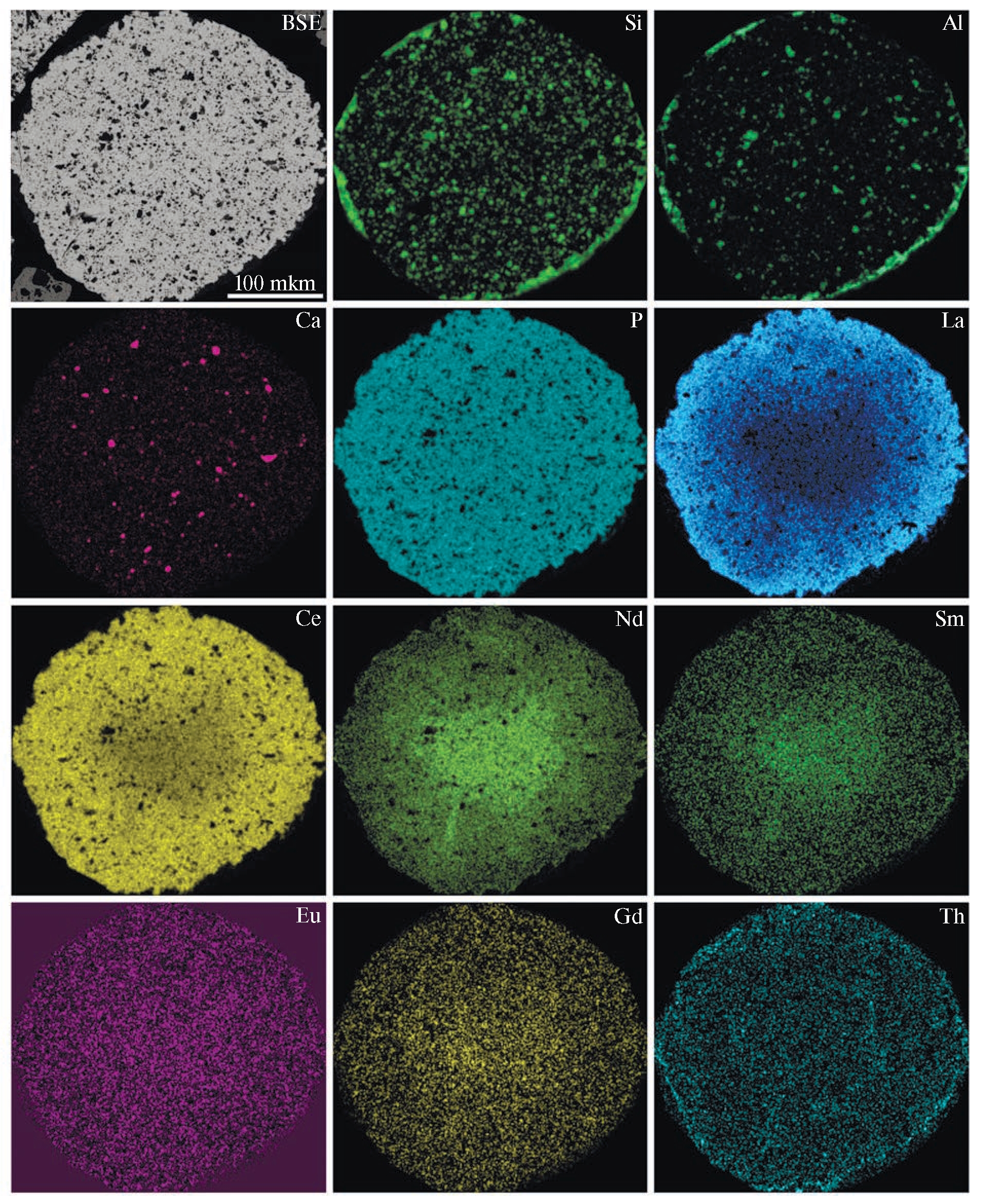 Морфология изученных зёрен НМ очень разнообразна: обломки вытянутой и изометричной формы с неровными краями, эллипсовидные и шаровидные образования (рис. 1‒3, а также [4]). Цвет зёрен НМ изменчив – от чёрного до желтовато-бурых оттенков; поверхность имеет неровный микро-бугристый вид. По данным СЭМ, ПРД, ИК и КР спектроскопии зерна НМ состоят из монацита с многочисленными, разного размера (от первых до 10‒20 микрон) включениями минералов (рис. 1‒4): кварца, калиевых полевых шпатов, альбита, мусковита, биотита, карбонатов (кальцита, доломита, сидерита), углеродистого вещества (УВ), магнетита, ильменита, рутила, группы плюмбогуммита (флоренсита, гойяцита), апатита, сульфидов (пирита, галенита, сфалерита, халькопирита), редко, ксенотима, цеолита, колумбита, киновари, количество которых варьирует от 30 до 60 об.%. В ИК-спектрах, полос валентных и деформационных колебаний Р‒О, ОН-связей, характерных для рабдофана, не обнаружено (рис. 4 в). В срезах эллипсовидные и шаровидные зёрна НМ проявляют очень слабую концентрическую зональность, выраженную в незначительном уменьшении зернистости в краевой части нодулей относительно центральной зоны, а также концентрической ориентированностью зёрен микровключений. В тоже время, в распределении REE зональность, чаще всего, ярко выражена и проявляется возрастанием содержаний La и Ce в краевой части нодулей, а в центральной – Nd, Sm, Eu, Gd (рис. 1).