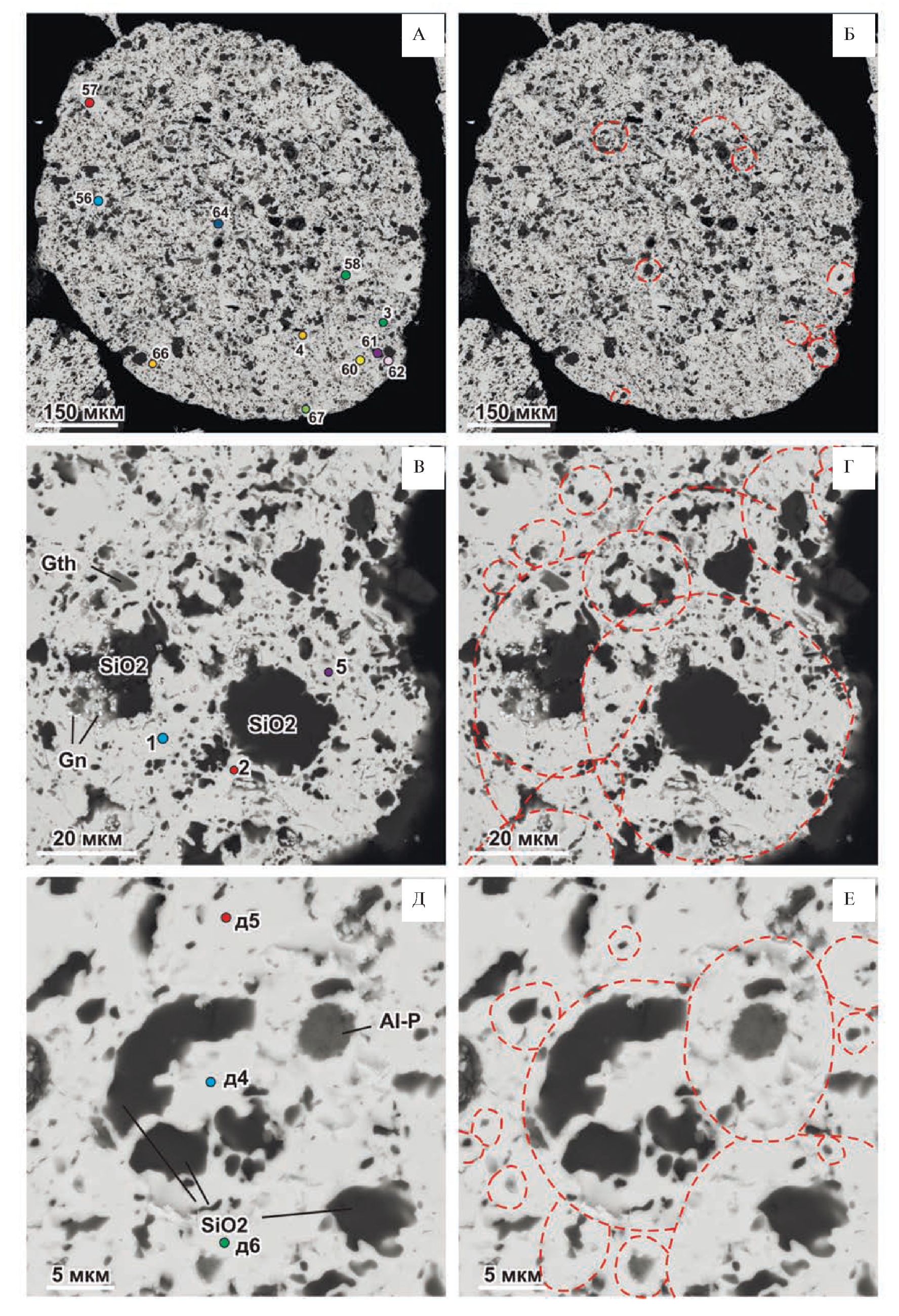Рис. 2. Снимки СЭМ зерна НМ с различной степенью детализации (А, В, Д) и подчеркнутыми бактериоморфными (“стромалитоподобными”) микроструктурами (Б, Г, Е). Белое – монацит; SiO2 – кварц; Gn – галенит; Al-P –флоренсит ((REE)Al3(PO4)2(OH)6; Gth – гётит.