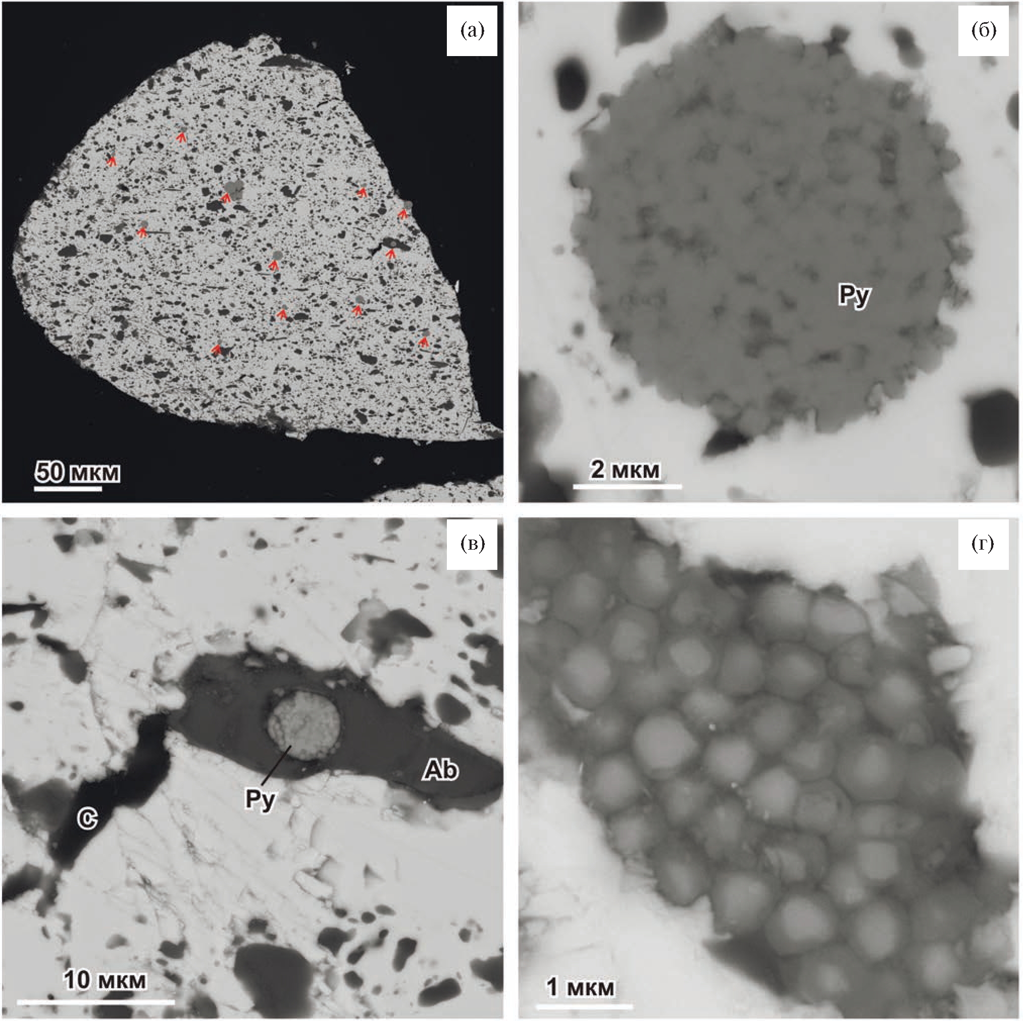 Рис. 3. Снимки СЭМ зерна НМ, содержащего ФП. На рис. 5Г представлен, расположенный в монаците ФП с маккинавитом, в котором каждый кристалл окружён пленкой органического вещества. Белое – монацит; Py – пирит; Ab – альбит; C – УВ; стрелками на рис. 5А указаны ФП.