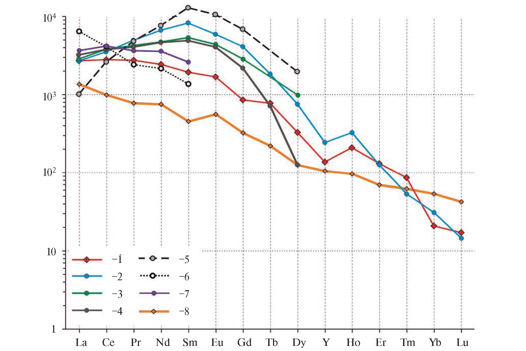6. Fig. 5. Distribution of REE in monazites and NM, normalized to NASC [10, 11]: 1 – Kular Ridge (average for NM Table 1); 2 – Ichet’yu area, Middle Timan (average for monazites [9]); 3 – Ur Creek (average for monazites [4]); 4 – Kular Ridge (this study, average according to SEM data of monazites); 5–7 – Ur Creek, average for monazites in different NM zones. 8 – REE in ores of the Buranny area of ​​the Tomtor Nb-REE deposit [12].
