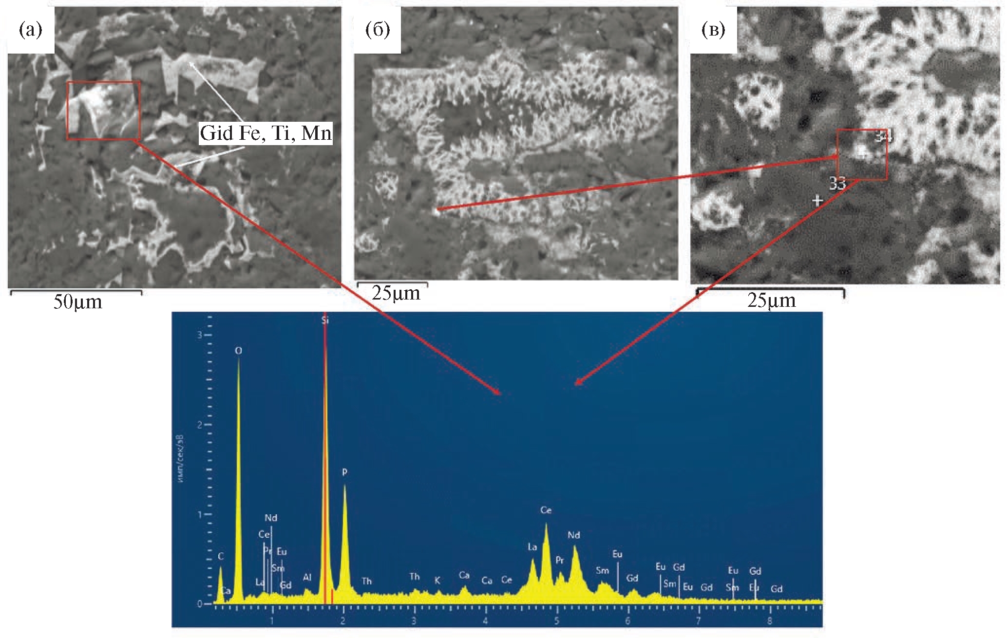 Рис. 3. Фотографии (а–в) и спектр сканирования лентообразных и кружевных выделений гидроксидов Fe, Mn и Ti с мелким включениями REE минералов, размеры которых не превышают 10 мкм, в щелочных риолитах Печальнинского рудного поля (обр. Д-22).