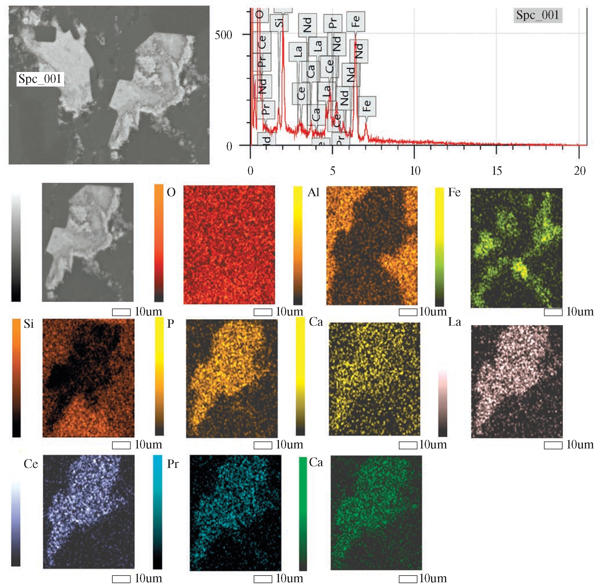 В наиболее крупном выделении минерала, содержащего REE (около 25 мкм по длинной стороне, обр. Д-22) установлено распределение отдельных элементов по площади, в которой отмечены (Спектр 001: SiO2 – 3.1, P2O5 – 21, CaO – 1.5, Fe2O3 – 33.9, La2O3 – 11, CeO2 – 21.9, Pr6O11 – 1.8, Nd2O3 – 5.9). Установлено, что распределение REE по площади выделения неравномерно (рис. 4), наиболее высокая интенсивность соответствует следующим элементам: P, La, Ce, Pr, Nd, Fe, которые пронизывает его от периферической части вглубь. Это указывает на тесную генетическую связь Fe и REE. Выполненное исследование позволяет определить выделение REE (рис. 4), как фосфат Ce – минерал группы монацита.