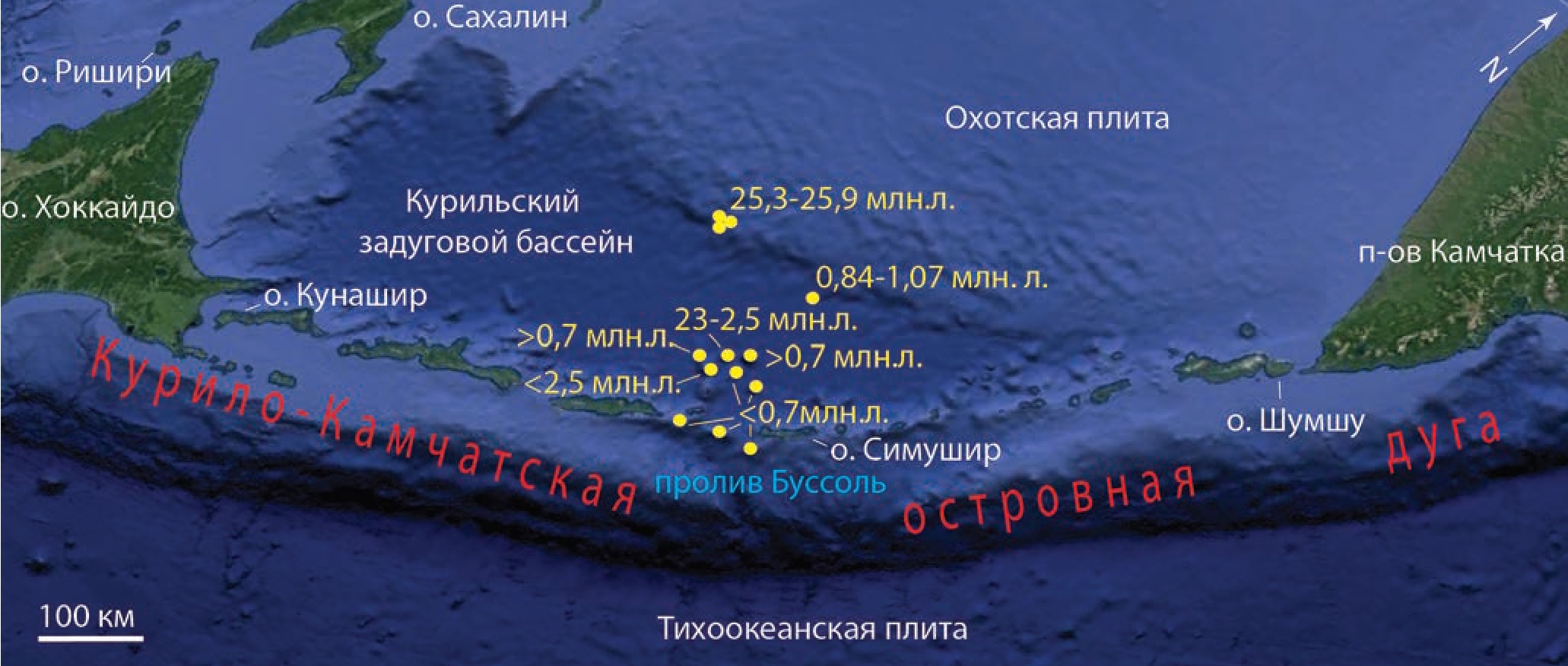 Параметры погружающего слэба варьируют. Так возраст слэба увеличивается с севера дуги к югу и меняется от 105 до 125 млн л. соответственно (рис. 4). Резкие изменения скорости погружения плиты наблюдаются в центральном сегменте ККОД, что находит отражение в формировании астеносферного апвеллинга по данным сейсмической томографии (рис. 3, 4). Проведение детальной батиметрии, гравиметрии и сейсмического профилирования позволило предположить зону растяжения в центральных Курилах и активную деструкцию, тектонической природы [12]. Сопоставление возраста формирования вулканов в глубоком тылу дуги свидетельствует об омоложении структур с 25 млн л. [7] до совсем молодых, возрастом менее 0.7 млн л. на фронте [2] (рис. 1). Важно отметить наличие многочисленных вулканических построек от о. Симушир до глубоководного жёлоба, что интерпретируется как наличие осевой магмотогенной зоны наложенного рифтогенеза [12]. Временная эволюция вулканов с тыла на фронт дуги позволяет предположить постепенное формирование грабена в проливе Буссоль, связанное в развитием отличающихся структур северных и южных Курил. Коллизия на о. Хоккайдо и развитие сдвиговых структур на южных Курилах связано с формированием преддугового грабена в проливе Буссоль [13].