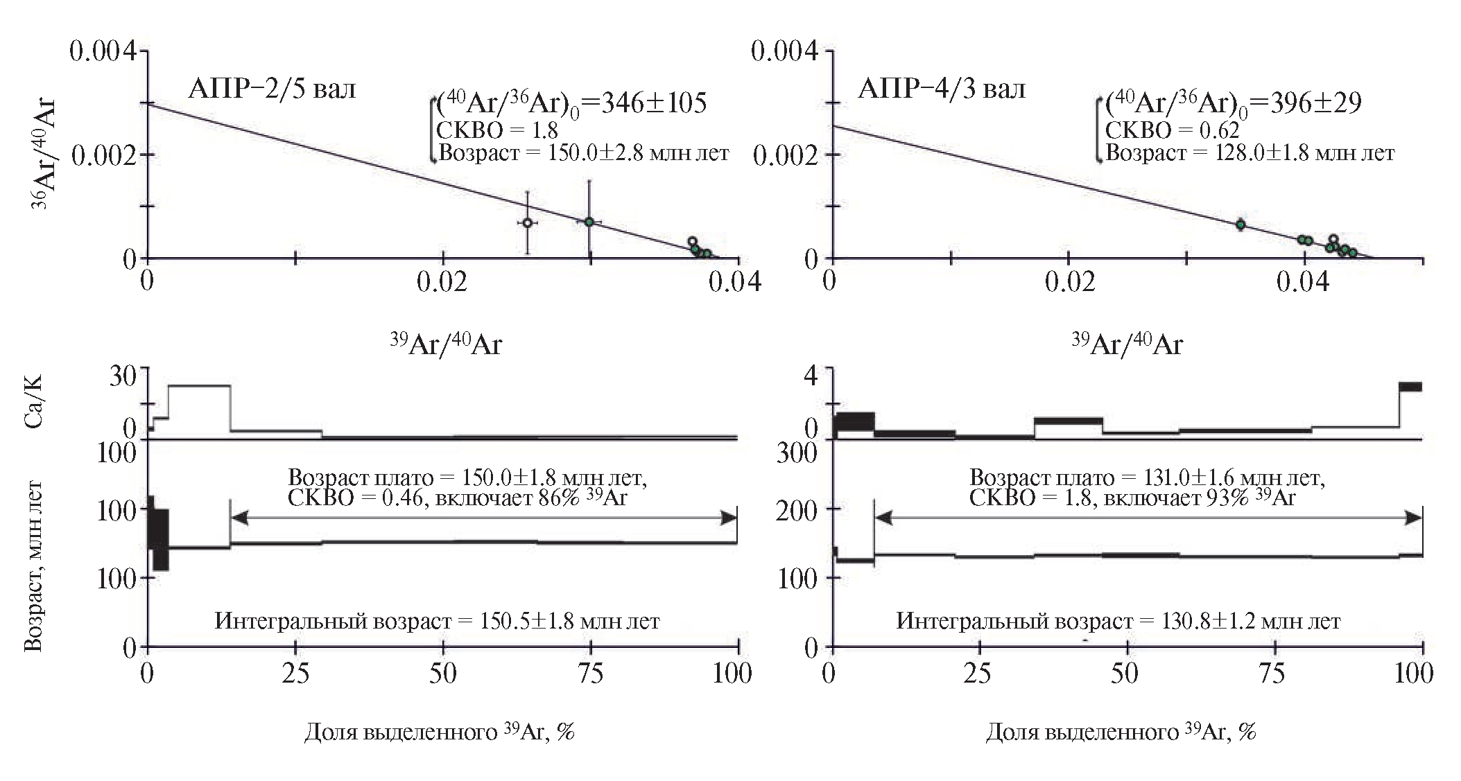 В пределах западного фланга Апрелковского поля вулканическая толща шадоронской серии (мощность около 300 м) сложена переслаивающимися покровами шошонитов, высококалиевых андезибазальтов, андезитов и дацитов (рис. 3 б). Наблюдается падение покровов под углом 20‒40° в север-северо-западном направлении. В возрастном 40Ar/39Ar-спектре валовой пробы высококалиевого андезибазальта (образец АПР-2/5) этой части вулканического поля выделяется плато. Согласно принятым критериям [13] (рис. 2) оно отвечает значению 150.8±1.8 млн лет, которое согласуется со значением 150.0±2.8 млн лет, рассчитанным для линейной регрессии на изохронной диаграмме. Учитывая, что формирование вулканических тел происходило на малых глубинах, где остывание до приповерхностных температур должно было происходить очень быстро, можно предположить, что значение возраста плато, как более точное, соответствует возрасту формирования породы.