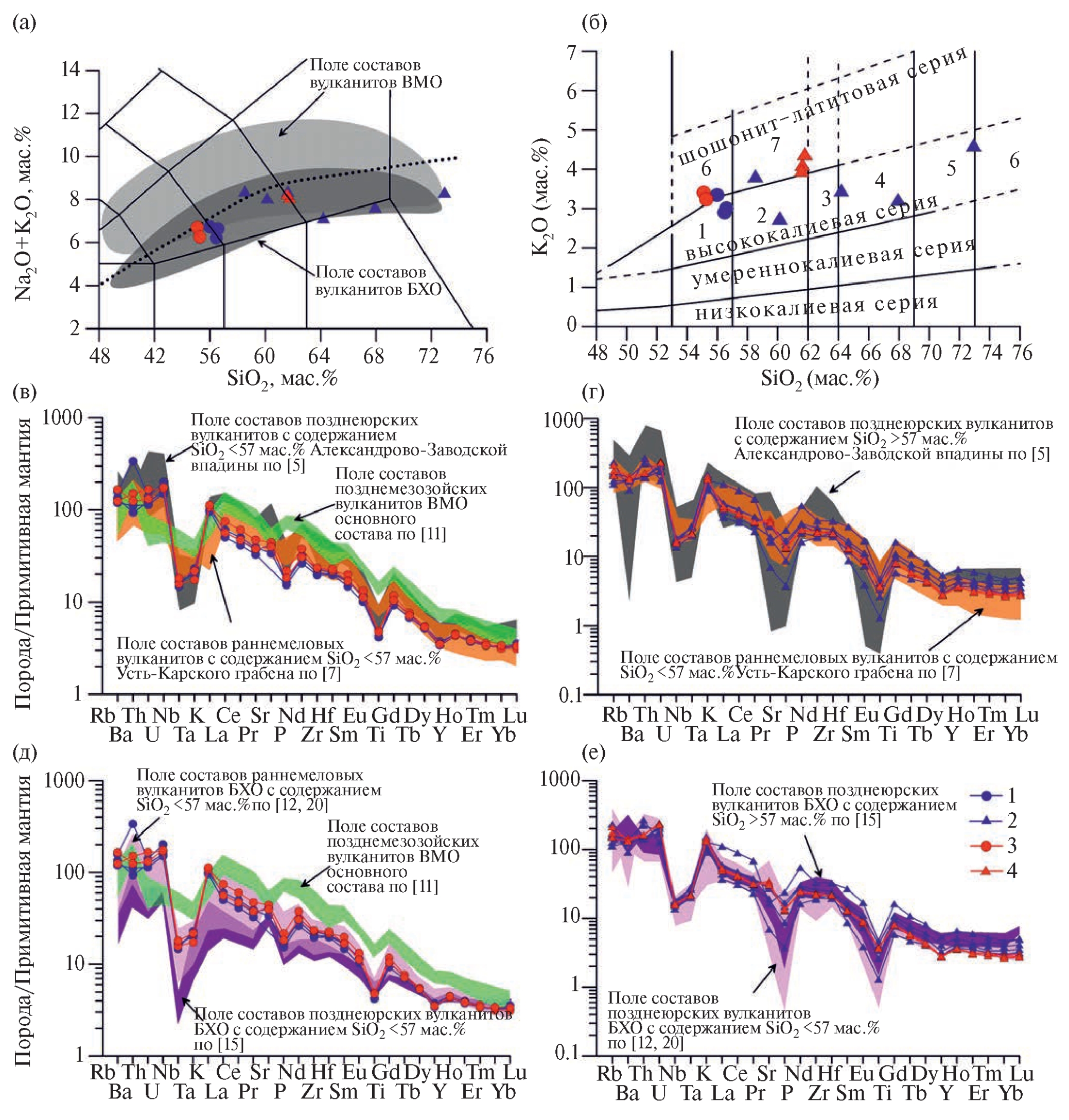 Рис. 3. Классификационные диаграммы и нормированные распределения редких элементов по [17] для вулканитов Нерчинской впадины: a) (Na2O+K2O) – SiO2, пунктирная линия (линия Ирвина-Барагара) разделяет поля составов щелочных и умеренно-щелочных пород по [14]; б) K2O – SiO2 по [16] с дополнениями по [4]; в, д) спайдердиаграммы для наиболее основных вулканитов, г,е) спайдердиаграммы для сиалических пород. 1–2 – вулканиты шадоронской серии (≈151 млн лет): 1 – SiO2 55–57 мас.%, 2 – SiO2 57–73 мас.%; 3–4 – вулканиты ундинодаинской серии (≈131 млн лет): 3 – SiO2 55–57 мас.%, 4 – SiO2 61–62 мас.%.