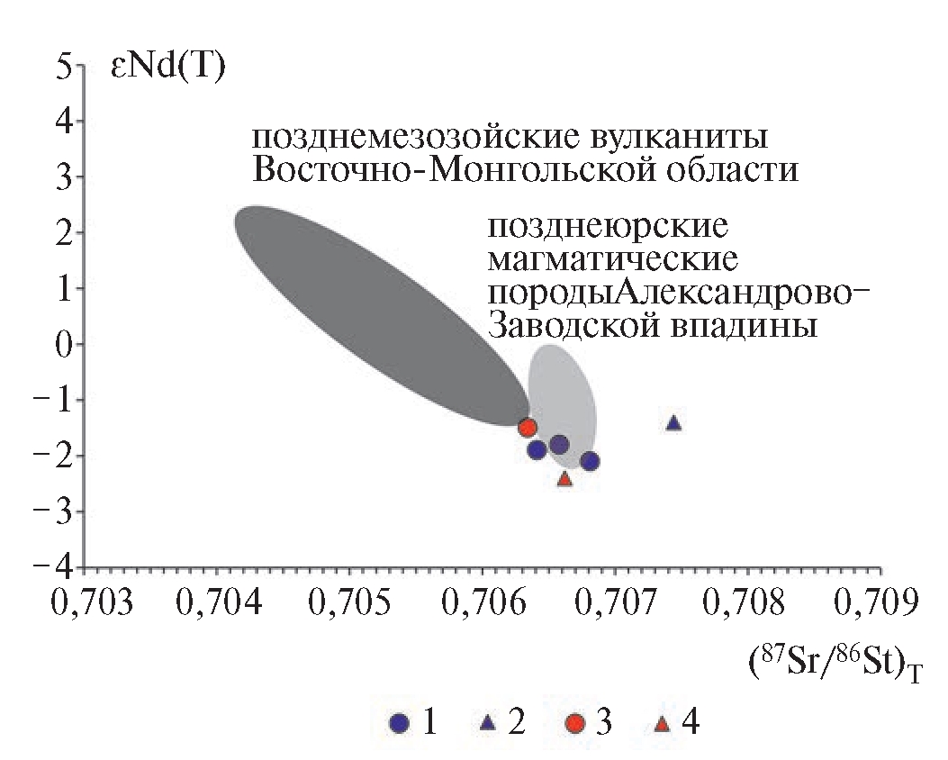 Рис. 4. Изотопный состав Sr и Nd в породах Нерчинской впадины. 1–2 – вулканиты шадоронской серии (≈151 млн лет): 1 – SiO2 55–57 мас. %, 2 – SiO2 57–73 мас. %; 3–4 – вулканиты ундинодаинской серии (≈131 млн лет): 3 – SiO2 55–57 мас. %, 4 – SiO2 61–62 мас. %.