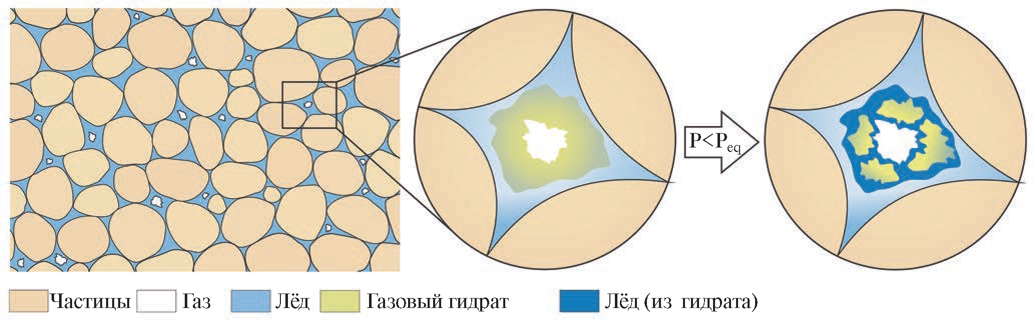 Рис. 1. Схематическая модель порового пространства мёрзлого газогидратонасыщенного песчаного грунта в равновесных и неравновесных условиях.