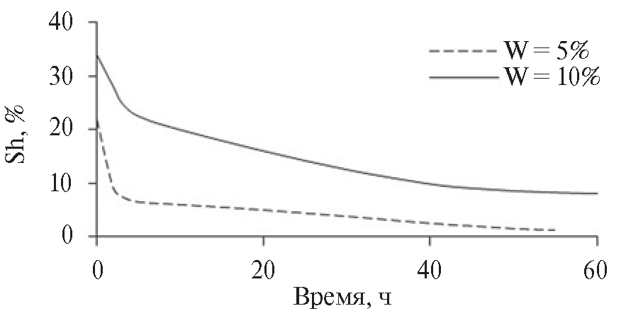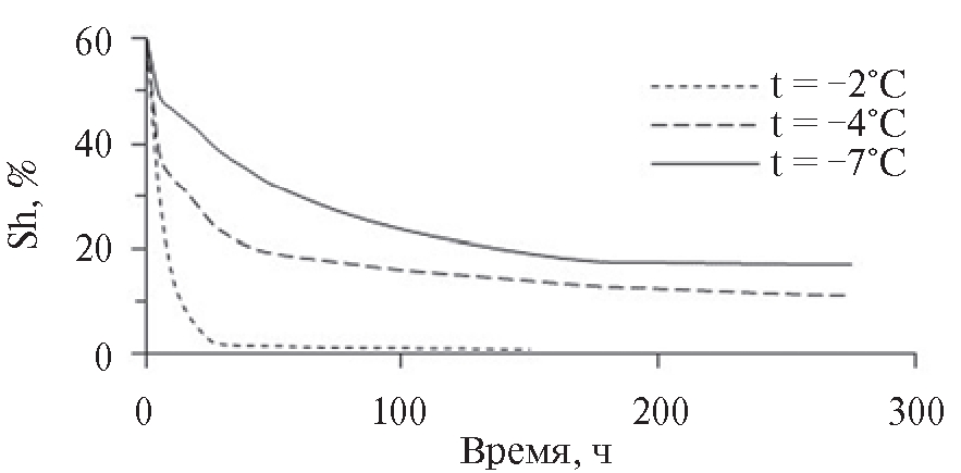 На основе аппроксимации экспериментальных данных в работе [6] (рис. 3) была предложена аналитическая зависимость остаточной гидратонасыщенности от времени в виде: