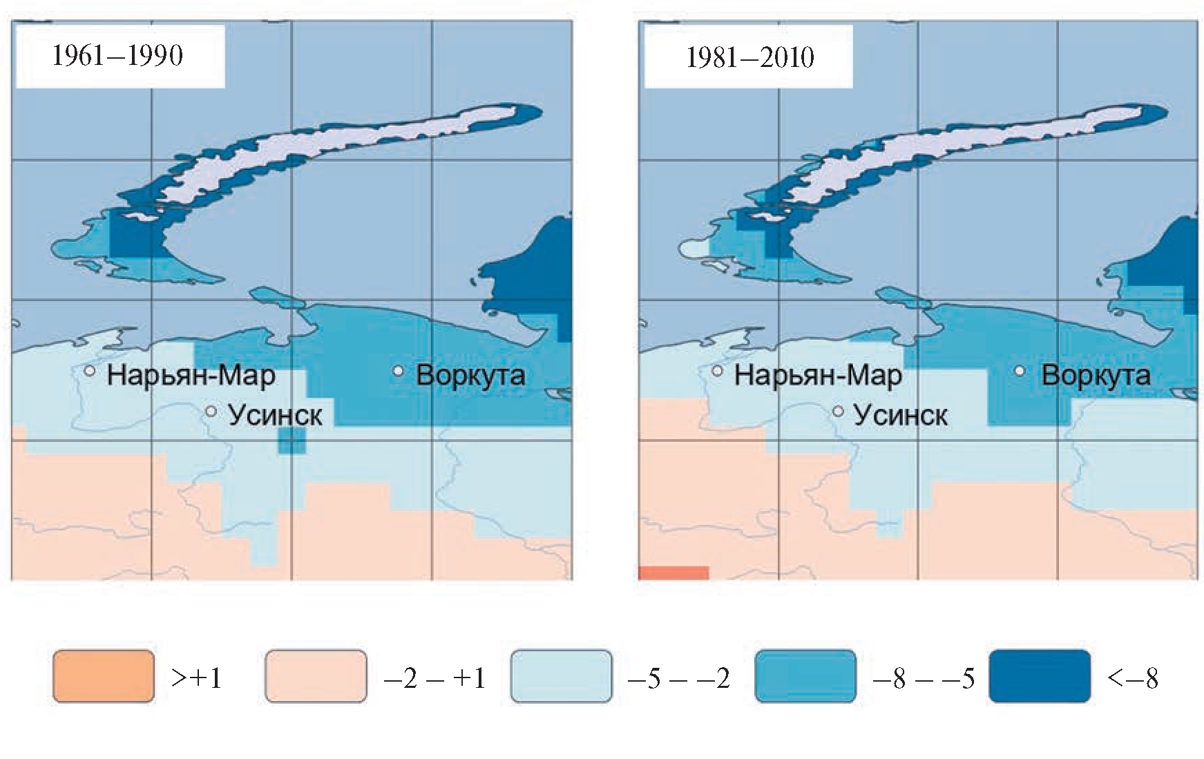 В связи с этим, особое значение приобретают исследования, целью которых является получение прогностических оценок изменения климатологических границ распространения многолетней мерзлоты в ближайшие десятилетия. При этом климатологические границы многолетней мерзлоты задаются разными способами [3–5]. Одним из традиционных способов является выделение зон сплошного, прерывистого и островного распространения многолетней мерзлоты на основе среднегодовой температуры воздуха [6–9]. В частности, в тех районах, где многолетняя мерзлота занимает более половины территории, среднегодовая температура воздуха (СГТ) не превышает –2°C [10].