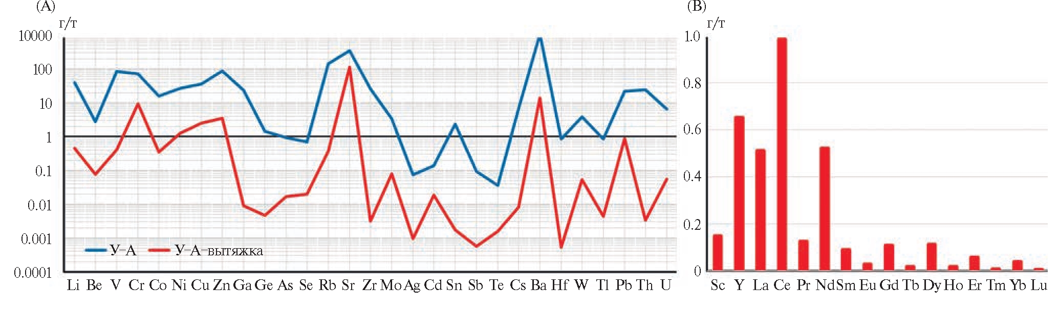 Рис. 4. А – диаграммы распределения содержаний микроэлементов в пробе У-А и в составе кислотной вытяжки из неё (в пересчёте на сухое вещество); В – содержание РЗЭ в вытяжке.