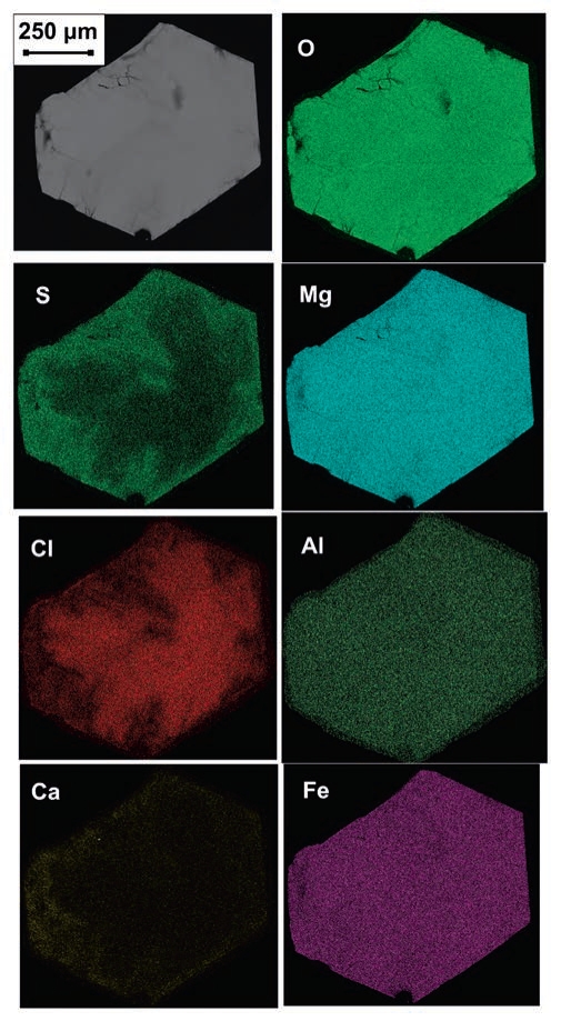 Таким образом, достоверно зафиксирован первый пример природного анионного обмена в минералах надгруппы гидроталькита. Упрощённые зарядово-сбалансированные схемы главных ионообменных реакций (без учёта возможного участия групп CO32– и H2O0) на айоваите из кимберлитовой трубки Удачная можно, базируясь на наших электронно-зондовых данных, представить так: (1) 2Cl– → SO42–; (2) 2Cl– → 2SO42– + Ca2+. Способность членов надгруппы гидроталькита к анионному обмену в природе представляется интересной с точки зрения использования этих минералов как геолого-генетических индикаторов. Они могут быть полезны для решения вопросов эволюции химизма поздних процессов, в т.ч. происходивших на рудных месторождениях.
