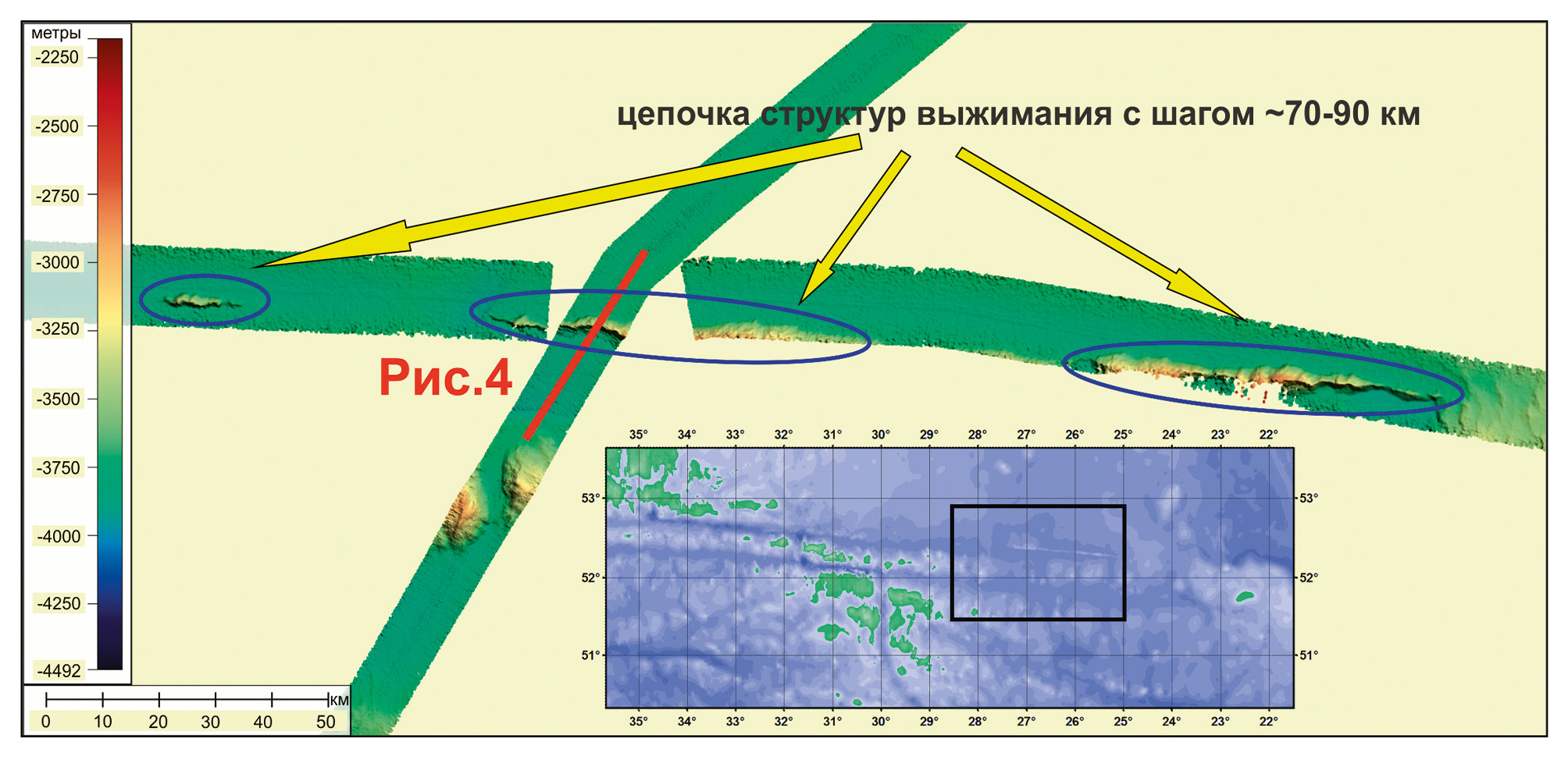Рис. 5. Полосы озвучивания рельефа дна по данным многолучевого эхолота 50-го и 53-го рейсов НИС “Академик Николай Страхов” (ГИН РАН, 2020, 2022) в северном троге разлома Чарли Гиббс. На врезке показано положение основного планшета в районе восточных пассивных частей трансформного разлома. Показано положение разреза рис. 4. Пояснения структур выжимания даны в тексте.