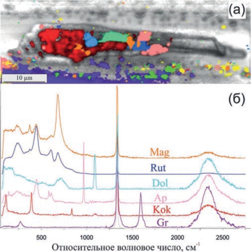 Рис. 4. Полифазное включение #2 в алмазе Vn-65: (а) Кр-карта включения #1 (цвета соответствуют спектрам на рисунке 4 б); (б) КР-спектры минералов, диагностированных во включении #2. Mag = магнетит, Rut = рутил, Dol = доломит, Ар = апатит, Kok = кокчетавит, Gr = графит.