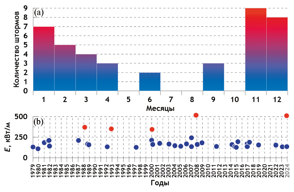 Три шторма из пяти сильнейших (табл. 1) приходились на ноябрь. На рис. 3 приведены гистограмма количества штормов по месяцам (а) и время формирования каждого шторма (b).