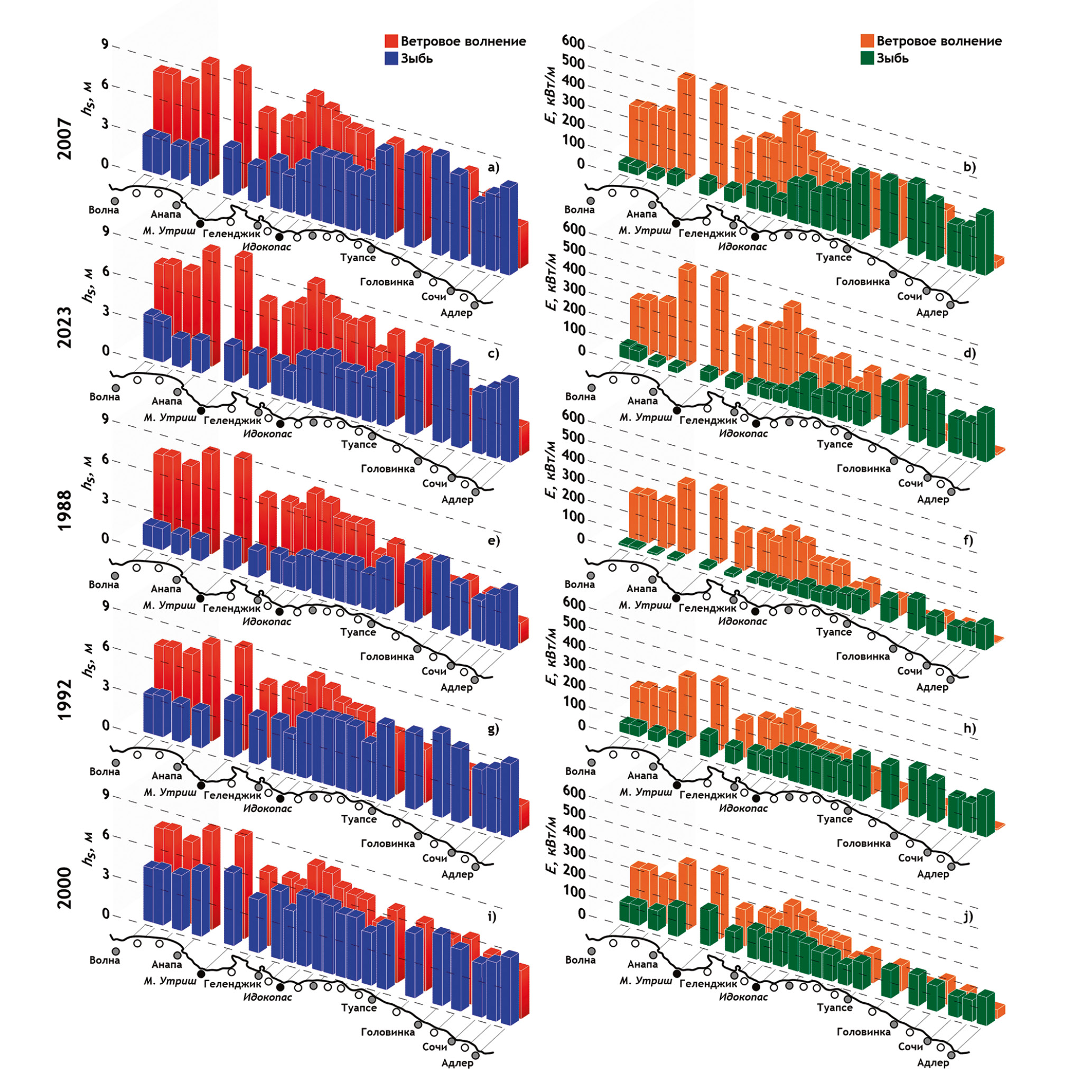 На рис. 5 в иллюстративной форме представлены максимальные значения значительных высот волн и мощностей компонент волнения в расчётных точках побережья для пяти сильнейших штормов из табл. 1: (a, b) – ноябрь 2007 г., (c, d) – ноябрь 2023 г., (e, f) – март 1988 г., (g, h) – ноябрь 1992 г., (i, j) – январь 2000 г.
