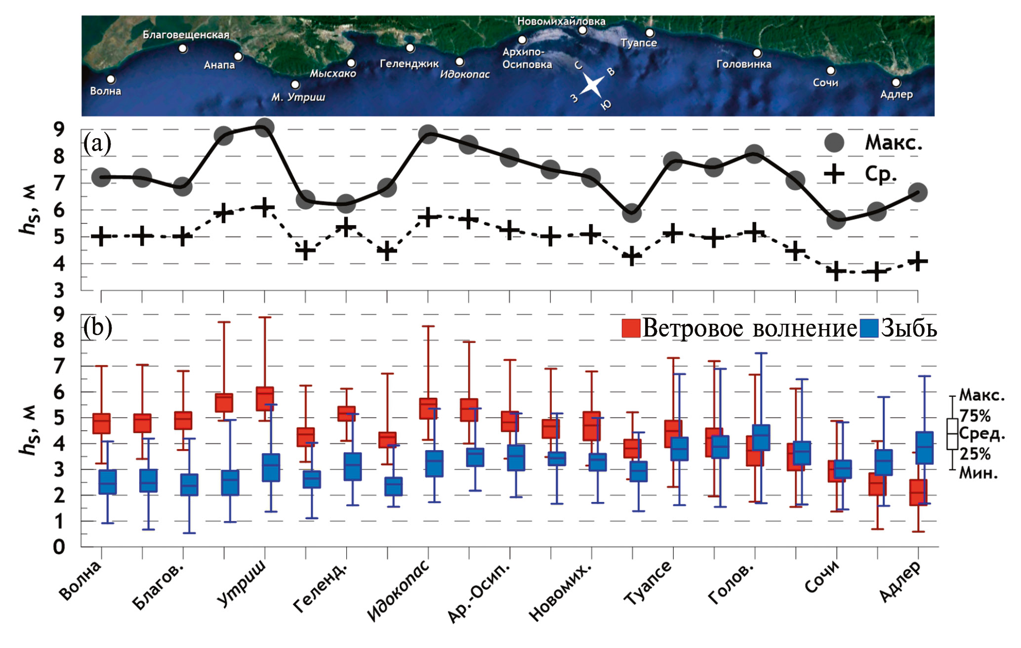 Тем не менее, данные рис. 5 позволяют выявить основные тенденции трансформации компонент смешанного волнения на всём протяжении береговой зоны: при движении с СЗ (п. Волна) на ЮВ (г. Адлер) высоты и мощности ветровых волн уменьшаются, зыби – наоборот, возрастают.