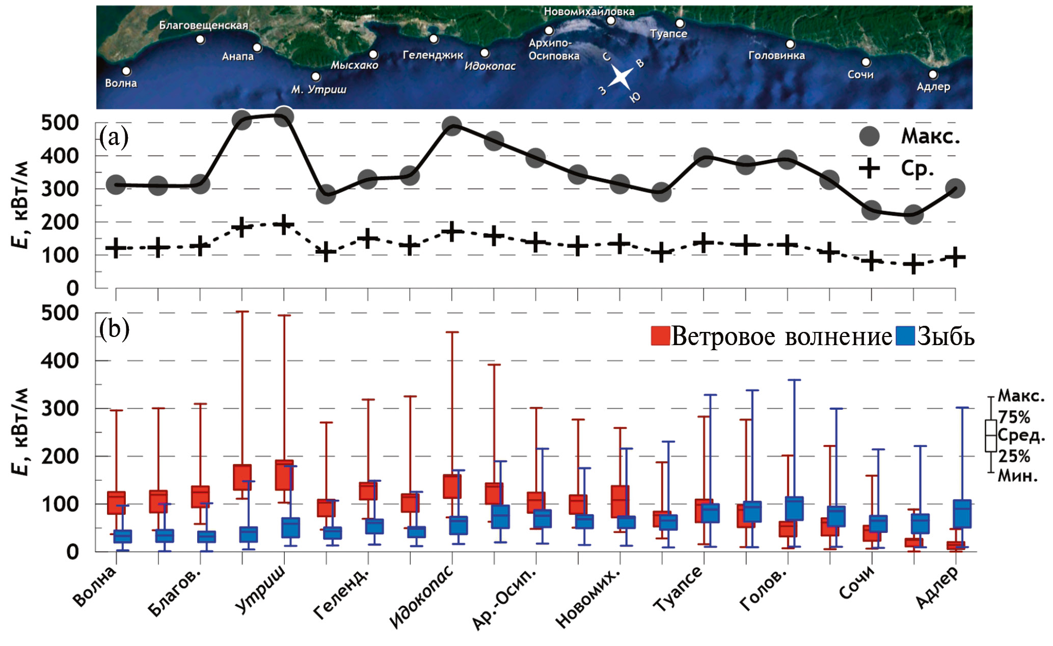 Как следует из рис. 6, 7, во время прохождения экстремальных штормов ЮЗ–З-направлений наибольшее волнение развивается в районах Анапы, Утриша и Идокопаса. В этих местах значительные высоты смешанного волнения могут достигать отметок в 9 м, мощности – более 500 кВт/м. Для сравнения: в урагане Wilma, пронесшемся над Мексиканским заливом в 2005 г., максимальная мощность волнения составила 814 кВт/м [17]. Средние высоты смешанного волнения для всего побережья колеблются в пределах 4–6 м (рис. 6 а), средние мощности – порядка 150 кВт/м (рис. 7 а). Наиболее опасные ветровые волны также формируются в окрестностях Анапы, Утриша и Идокопаса, зыби – на участке от Туапсе до Головинки, а также в районе Адлера (рис. 6 b, 7 b). В Головинке волны зыби могут достигать 7.5 м, Адлере – 6.5 м.