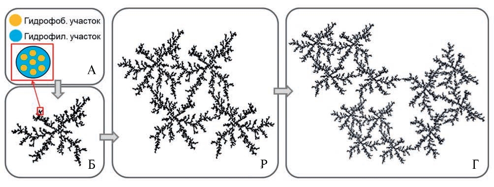 В основе почвенных гелей лежат взаимодействия между частицами-молекулами гуминовых веществ (ГВ) [3, 5], имеющих мозаичную дифильную поверхность [13] (рис. 1 А). Эти частицы-молекулы формируют НМО [10, 14, 15]. НМО могут различаться структурной организацией: до 100 нм они существуют в виде фрактальных кластеров (Ф-кластеров) (рис. 1 Б), а при больших размерах – выходят из интервала существования фрактальности (рис. 1 В). НМО, взаимодействуя между собой и минеральными частицами, образуют почвенные гели (рис. 1 Г). То есть, в основе гелевой модели лежат взаимодействия между частицами органического вещества.