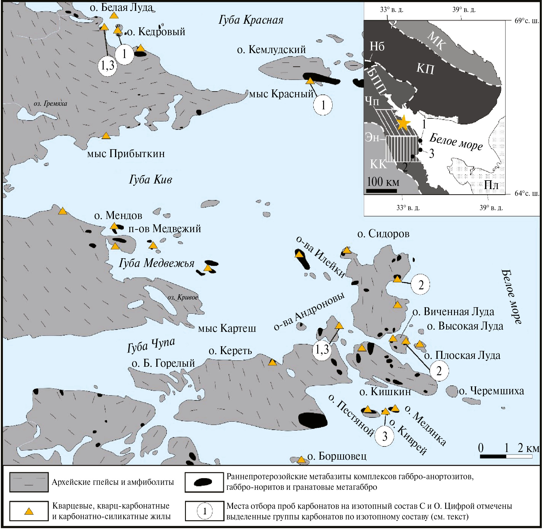Рис. 1. Геологическая схема района исследования (модифицировано из [3]). На врезке расположение района исследований (звездочка) в восточной части Балтийского щита. Главные террейны в восточной части Балтийского щита по [7] и сектора Беломорского подвижного пояса по [4]: БПП — Беломорский подвижный пояс, Чп — Чупинский сектор БПП, Эн — Энгозерский сектор БПП; МК — Мурманский кратон; КК — Карельский кратон; КП — Кольская провинция; Нб — провинция Норрботтен; Пл — платформенный чехол. Проявления карбонатных пород Энгозерского сектора по [7, 12]: 1 — село Гридино, 2 — реки Поньгома и Сигма, 3 — остров Мраморный.