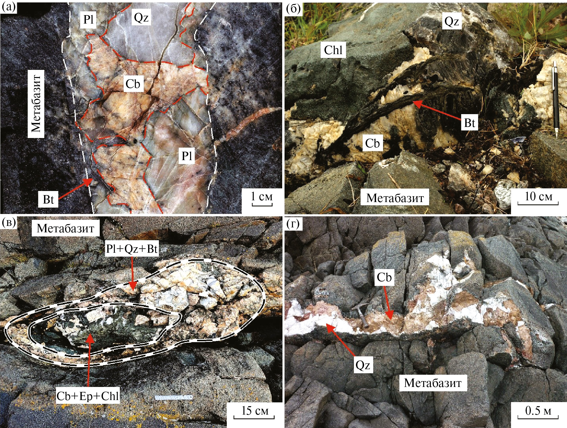 Рис. 2. Жильные проявления крупнокристаллических карбонатов с изученным изотопным составом O и C: (а) кальцит-доломит-биотит-кварцевая жила, обр. КР-30; (б) кальцит-биотит-кварцевые сростки, обр. СИД-21; (в) зональная жила с биотит-кварц-плагиоклазовой внешней зоной и кальцит-доломит-эпидот-хлоритовой внутренней зоной, обр. СИД-9; (г) кварц-кальцит-доломитовая жила, обр. КР-19а. Подписи минералов: Bt — биотит; Cb — карбонат; Chl — хлорит; Ep — эпидот; Pl — плагиоклаз; Qz — кварц.