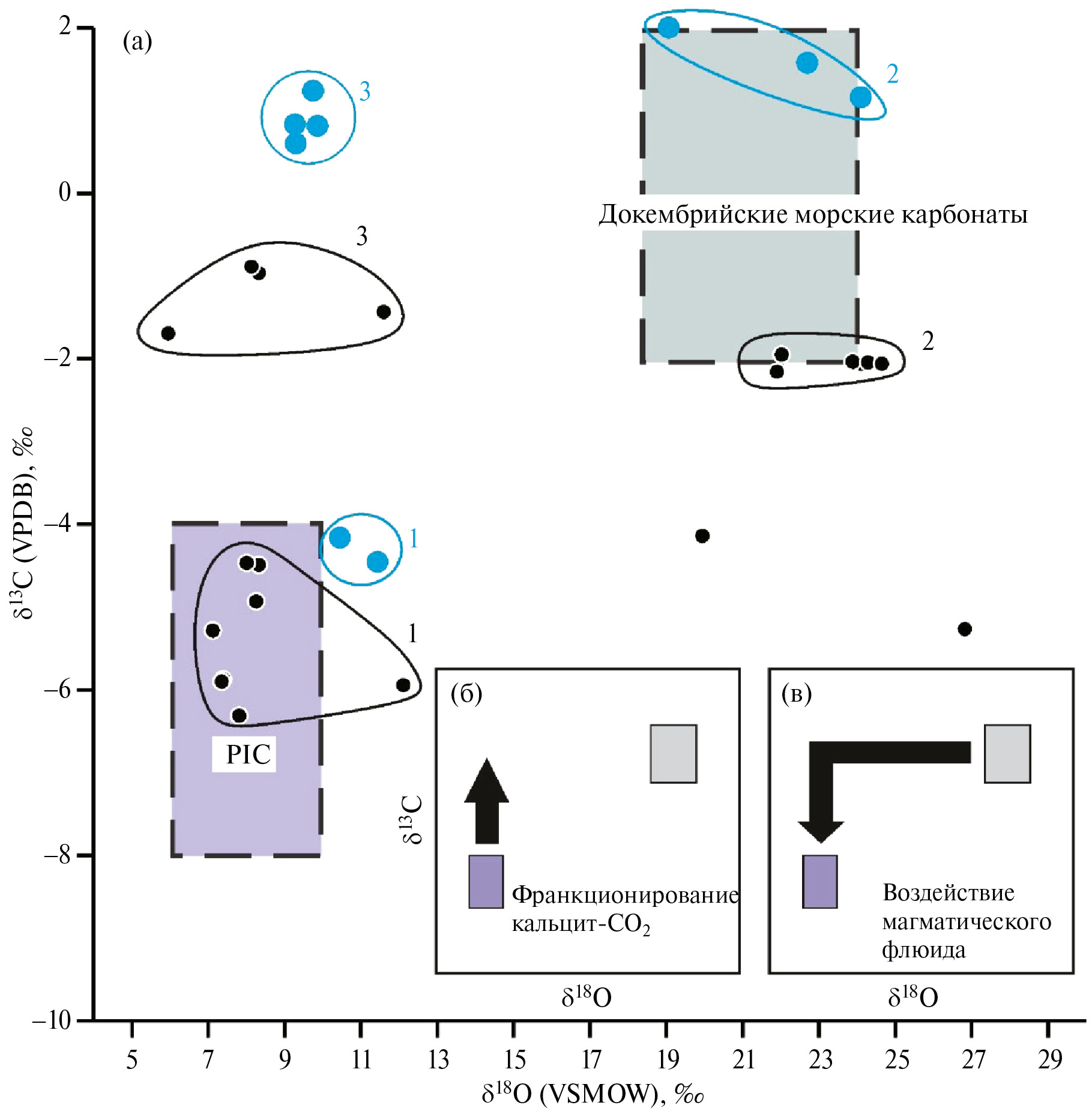 Рис. 3. (а) Изотопный состав кислорода и углерода карбонатов. Чёрные кружки — жильные карбонаты Чупинского сектора БПП, настоящая работа; синие кружки – составы карбонатных пород Энгозерского сектора БПП по данным [12]. Пунктиром оконтурены поля, характерные для первично магматических карбонатов PIC [11] и для докембрийских морских карбонатов [17]. Цифрами отмечены выделяемые группы карбонатов по изотопным характеристикам C и O. На врезках (б) и (в) показаны варианты интерпретации наблюдаемых изотопных параметров (см. обсуждение).