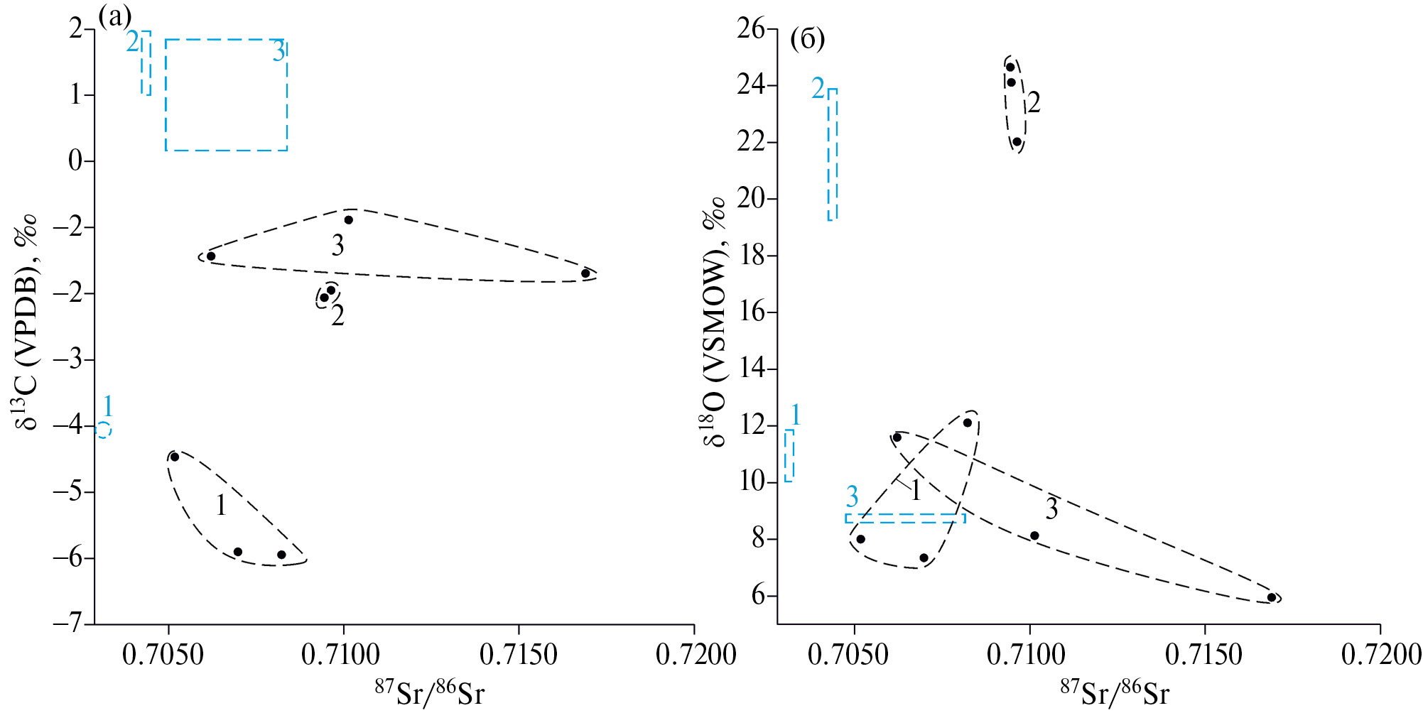 Рис. 4. Изотопные отношения 87Sr/86Sr в жильных карбонатах Чупинского сектора БПП, (настоящая работа, чёрный цвет), а также карбонатных пород Энгозерского сектора БПП по данным [12] (синий цвет). Группы 1–3 выделены по соотношению величин δ18О и δ13С (рис. 3).