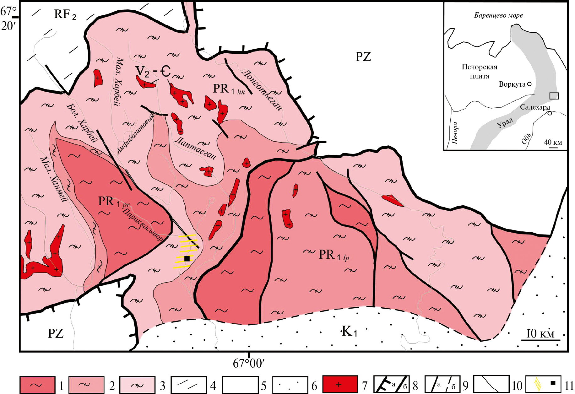 Рис. 1. Схематическая геологическая карта харбейского амфиболит-гнейсового комплекса (с использованием материалов [3]). Условные обозначения: 1–3 — харбейский метаморфический комплекс: 1 — париквасьшорская свита, 2 — лаптаюганская свита, 3 — ханмейхойская свита; 4 — верхнепротерозойские отложения западной тектонической зоны, 5 — палеозойские породы Тагило-Магнитогорской зоны; 6 — мезозойские отложения Западно-Сибирской платформы; 7 — гранито-гнейсы; 8–9 — разрывные нарушения: 8 — главные (а — ГУР, б — шарьяж), 9 — второстепенные (а — надвиги, б — неустановленной морфологии); 10 — граница между свитами; 11 — зона развития исследуемых пород и точка отбора пробы гранат-биотитового плагиогнейса для U–Pb-изотопно-геохронологического исследований циркона.