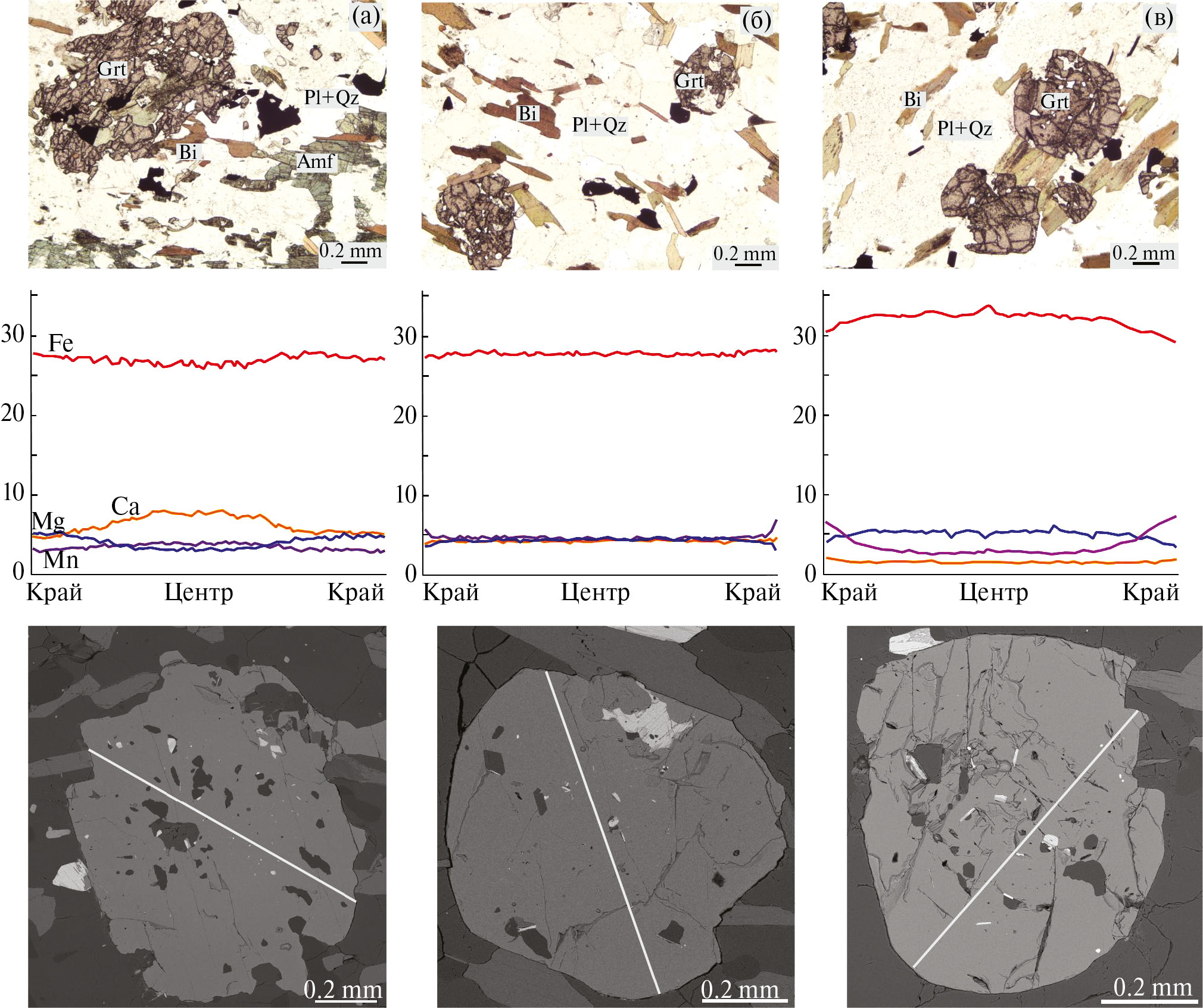 Рис. 2. Текстурные и структурные особенности Grt-Bi-Amf-Qz-Pl сланцев (a), меланократовых (б) и лейкократовых (в) Grt-Bi плагиогнейсов c характерными для них распределениями элементов в гранатах по профилям. Фото шлифов сделаны при одном николе.