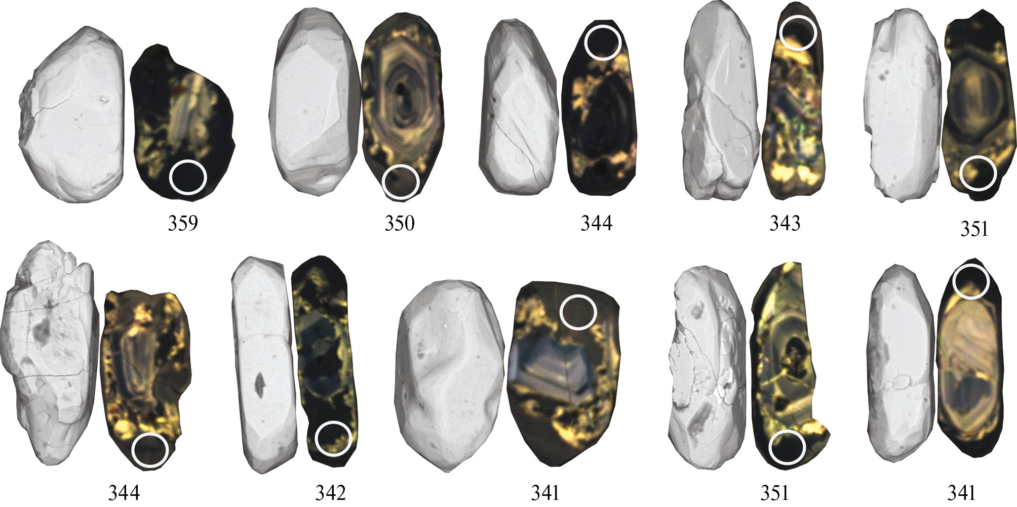 Изучение циркона из лейкократового Grt-Bi плагиогнейса (риолитового метатуфа) показало, что минералы имеют розовую и тёмно-розовую окраску, длиннопризматическую, призматическую формы со сглаженными рёбрами, а также представлены поликристаллическими агрегатами размером от 0.05 мм до 0.2 мм (рис. 5). На изображениях циркона в режиме катодолюминесценции (CL) наблюдаются ядра и регенерационные каймы (рис. 5). Ядра представлены призматическими, часто хорошо огранёнными кристаллами, обломками или разъеденными зёрнами размером от 0.03 до 0.1 мм с включениями кварца и фторапатита. Регенерационная кайма состоит из двух зон. Первая зона примыкает непосредственно к ядерной части и на снимках в режиме CL имеет светлую пятнистую окраску. Вторая зона тёмная однородная. Включения в каймах представлены биотитом, плагиоклазом и кварцем. Мощность регенерационных кайм до 0.06 мм.