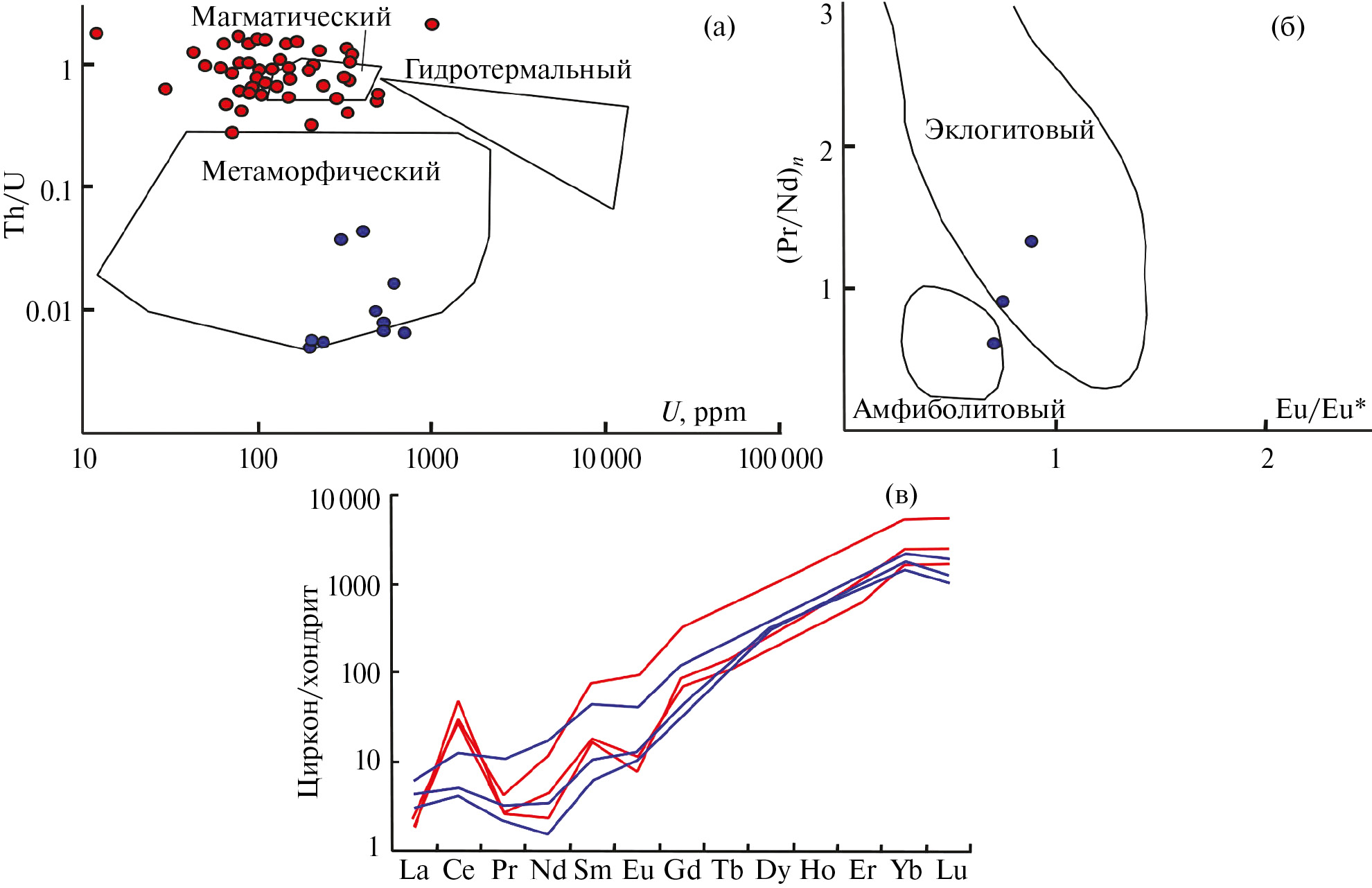 Рис. 6. Точки составов ядер (красные) и регенерационных кайм (синие) циркона из Grt-Bi плагиогнейса на идентификационных диаграммах U–Th/U (a [1]) и Eu/Eu*–(Pr/Nd)n (б [5]), а также нормированные на состав хондрита [20] спектры содержаний РЗЭ ядер и кайм (в, цвета линий соответствуют цветам точек).