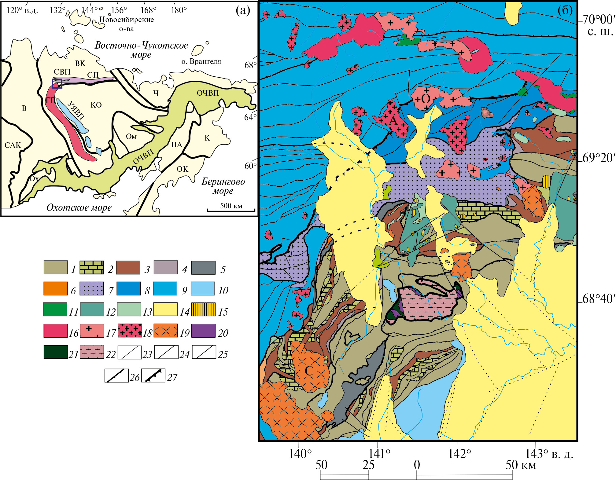 Рис. 1. Схема орогенных поясов (по данным [8], с изменениями) (а) и геологическая карта области сочленения Главного и Северного батолитовых поясов, Верхояно-Колымская складчатая область, (по данным [4], с изменениями) (б). (а) В — Верхоянский складчато-надвиговый пояс. Орогенные пояса: ВК — Верхояно-Колымский, Ч — Чукотский; ЮА — Южно-Анюйский; К — Корякский; ПА — Пенжинско-Анадырский; ОК — Олюторско-Камчатский. САК — Северо-Азиатский кратон. Кратонные террейны: Ох — Охотский; ОМ — Омолонский. КО — Колымо-Омолонский супертеррейн. Вулканические пояса: УЯВП — Уяндино-Ясачненский, ОЧВП — Охотско-Чукотский, ГП – Главный батолитовый; СП – Северный батолитовый, СВП – Северный вулкано-плутонический. (б) 1 — терригенно-карбонатные отложения ордовика; 2 — терригенно-карбонатные отложения силура; 3 — карбонатные отложения нижнего–среднего девона; 4 — терригенно-карбонатные отложения верхнего девона – нижнего карбона; 5 — вулканогенно-терригенные отложения карбона; 6 — кремнистые отложения перми; 7 — терригенные отложения верхнего триаса; 8 — туфотерригенные отложения нижней юры; 9 — терригенные отложения средней юры; 10 — туфогенно-терригенно-вулканогенные отложения основного, среднего, кислого состава верхней юры; 11 — туфогенно-вулканогенные отложения среднего–кислого состава нижнего мела (тумусская толща); 12 — вулканогенные отложения основного–среднего–кислого состава нижнего мела (джахтардахская свита); 13 — туфогенно-вулканогенные отложения кислого состава нижнего мела (сасыл-тиннахская толща); 14 — неоген-четвертичные отложения; 15 — экструзивные купола трахиандезитов позднего мела; 16–19 — раннемеловые интрузии: 16 — эликчанского комплекса, 17 — омчикандинского комплекса, 18 — арга-эмнекенского комплекса, 19 — саханьинского комплекса; 20, 21 — Калгынский офиолитовый массив: 20 — дуниты–гарцбургиты, 21 — габбро-амфиболиты, амфиболиты; 22 — палеозойские (?) отложения — сланцы, амфиболиты, гнейсы, кварциты, мраморы; 23 — геологические границы; 24–27 — разломы: 24 — взбросы, сбросы, 25 — второстепенные надвиги, 26 — главные надвиги, 27 — шарьяжи. Буквами обозначены массивы: А — Арга-Эмнекенский, О — Омчикандинский, С — Саханьинский.