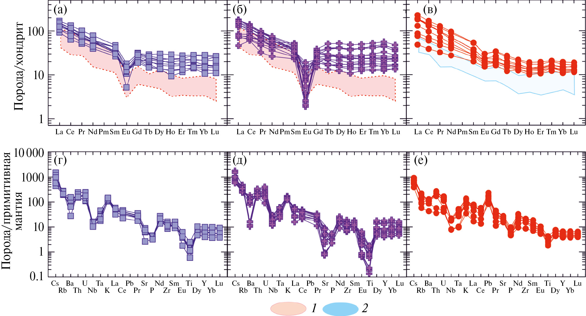 Рис. 4. Хондрит-нормализованные распределения РЗЭ (а–в) и спайдерграммы редких элементов, нормированных на состав примитивной мантии, (г–е) гранитоидов саханьинского, омчикандинского и арга-эмнекенского комплексов. 1, 2 — гранитоиды по [1]: 1 — коллизионные, 2 — субдукционные.